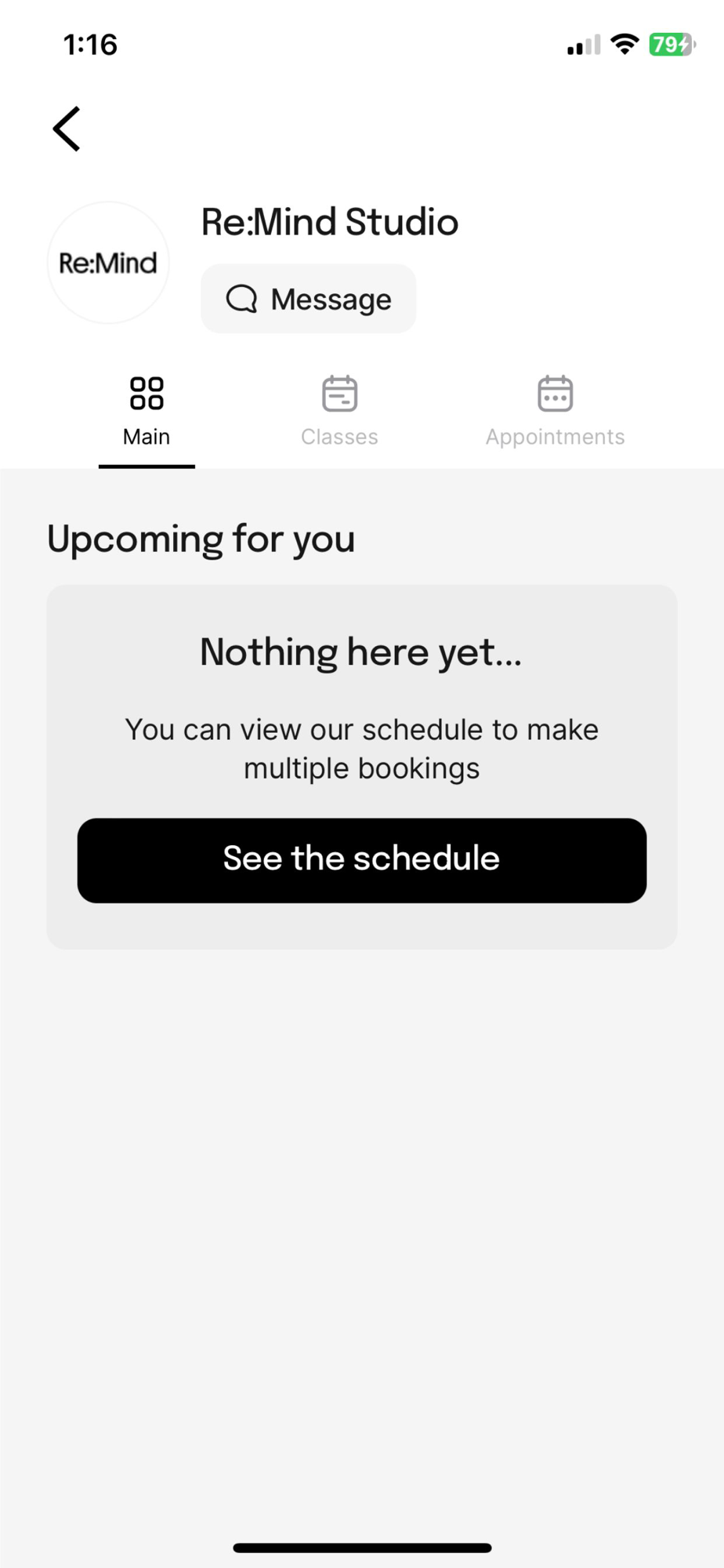 The Re:Mind Studio app makes it very easy for you to manage your Re:Mind Studio account, book into our classes and events, watch our on-demand content, and keep in touch with us. You can easily message us if you have a question or want to share something with them. You can also follow our public feed to see any announcements we make, promos we run, or content we share.