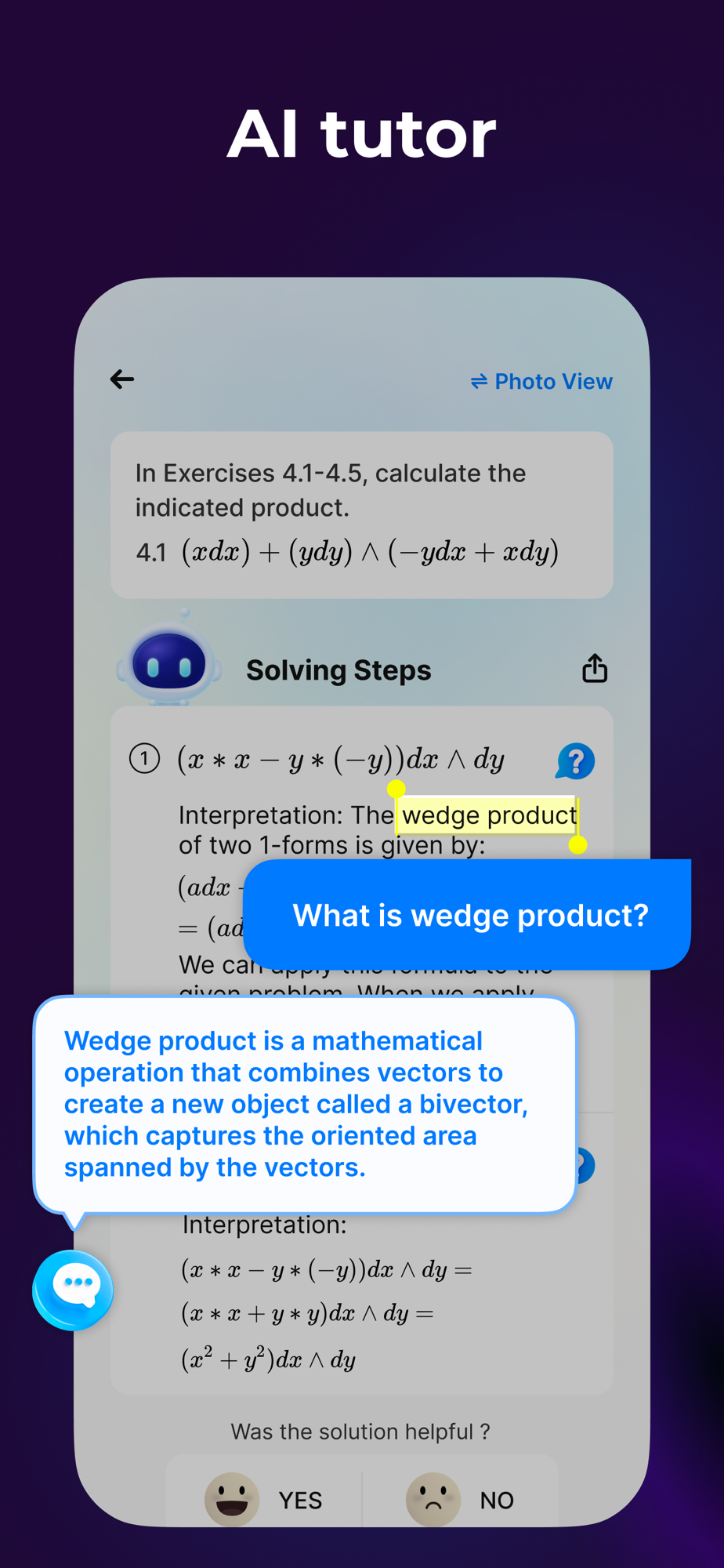 With Solvely's AI tutor, you can ask questions, seek clarifications, and receive personalized explanations to master any topic on math, science, and liberal arts. Stuck on a concept? Confused with a step in the solution? Don't worry! Solvely's AI tutor gets unstuck 24/7. Whether it's algebraic equations, complex physics concepts, or tricky chemistry problems, our AI tutor ensures you grasp the subjects and problem-solving processes with personalized explanations. Embrace confidence in your studies with Solvely's dedicated AI tutor by your side, guiding you every step of the way.