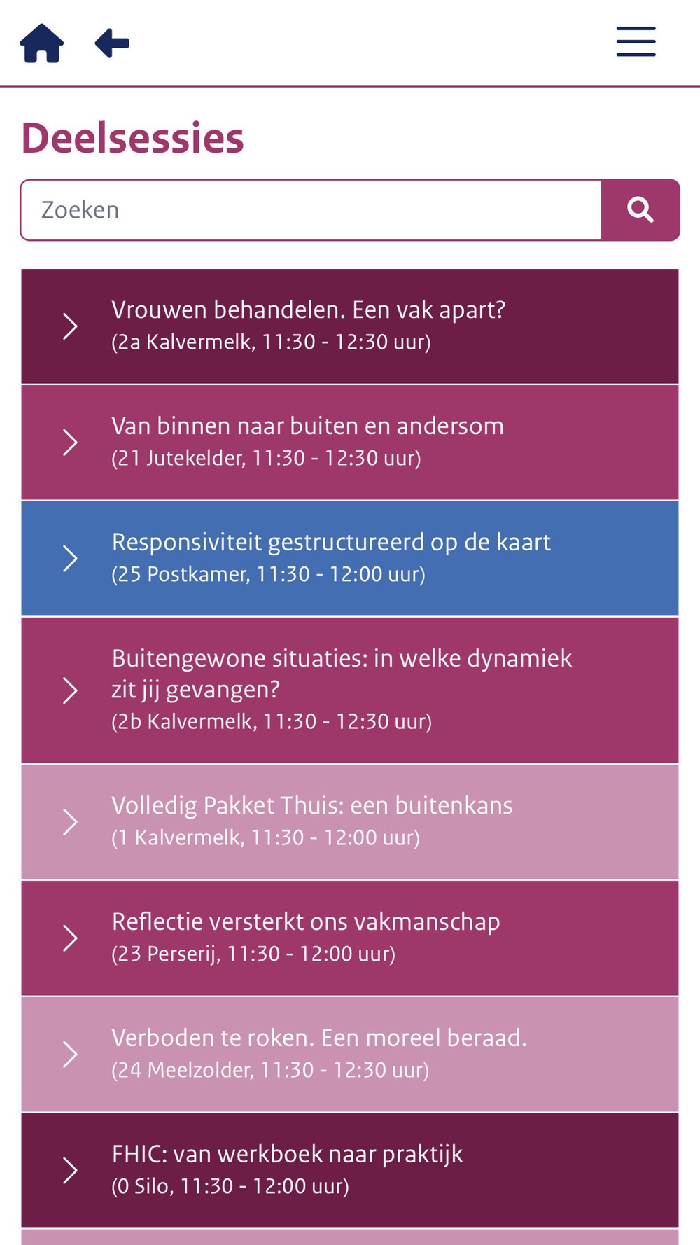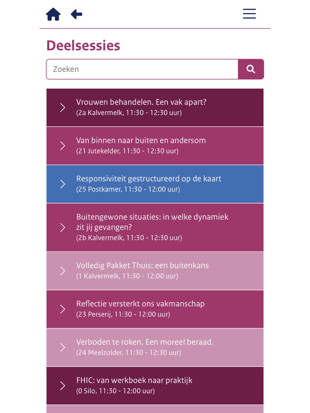 • Sprekerslijst, inclusief de mogelijkheid om direct via de app met hen te chatten en een afspraak te maken.