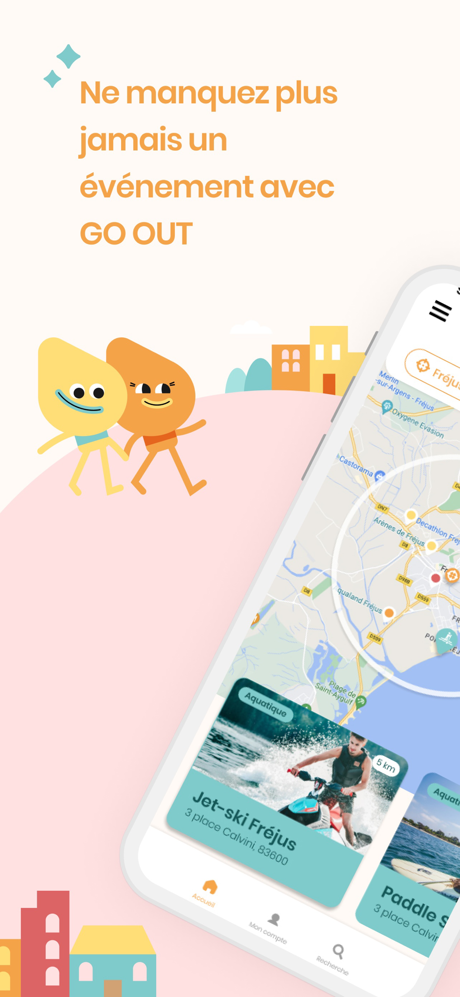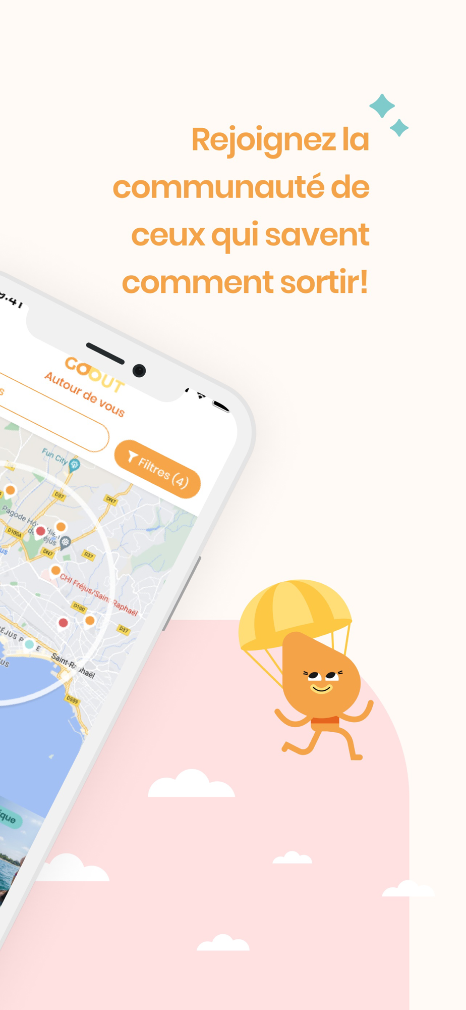Une fois téléchargée géolocalisez-vous ou choisissez une ville, définissez un périmètre en km et sélectionnez la catégorie de votre choix découvrez les activités proposées par Go Out !