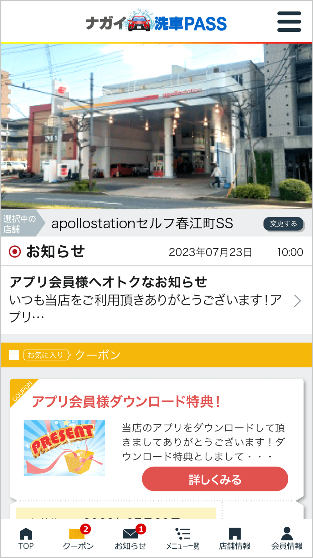 当社の公式アプリ「ナガイ洗車パスポート」ではアプリで洗車サービスのご利用が可能の他、当店で利用いただけるお得なクーポンや各種メニューの割引情報を配信しております。