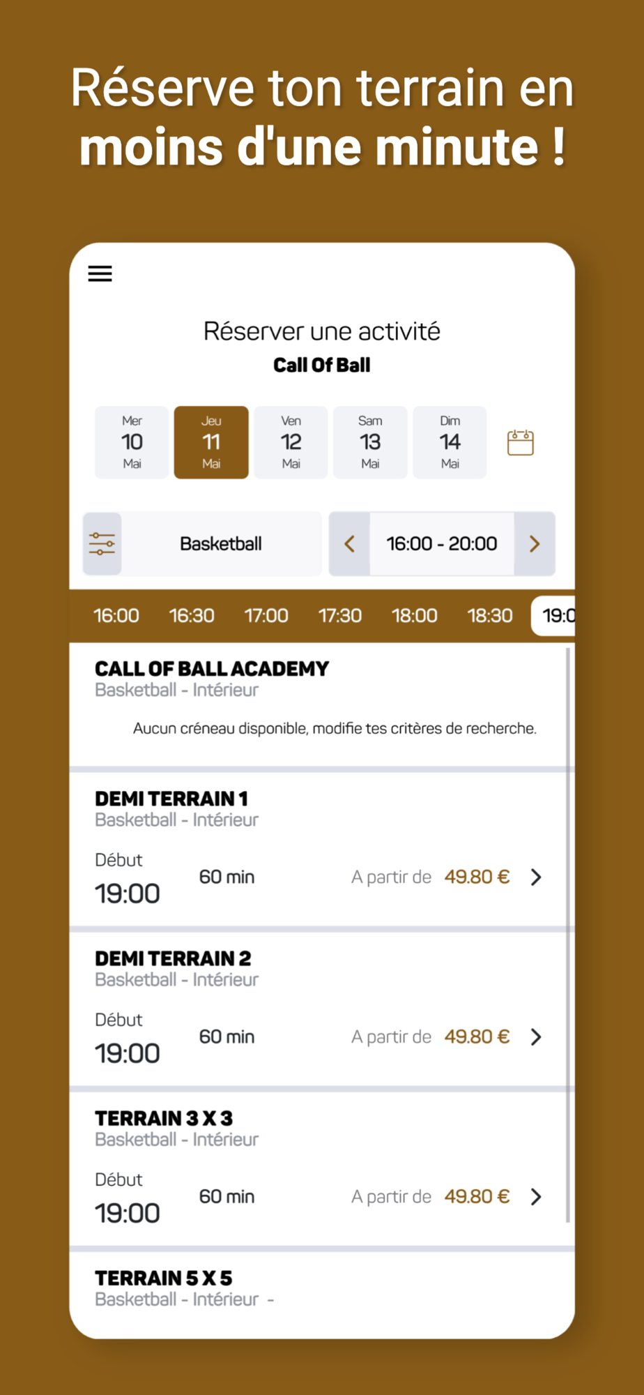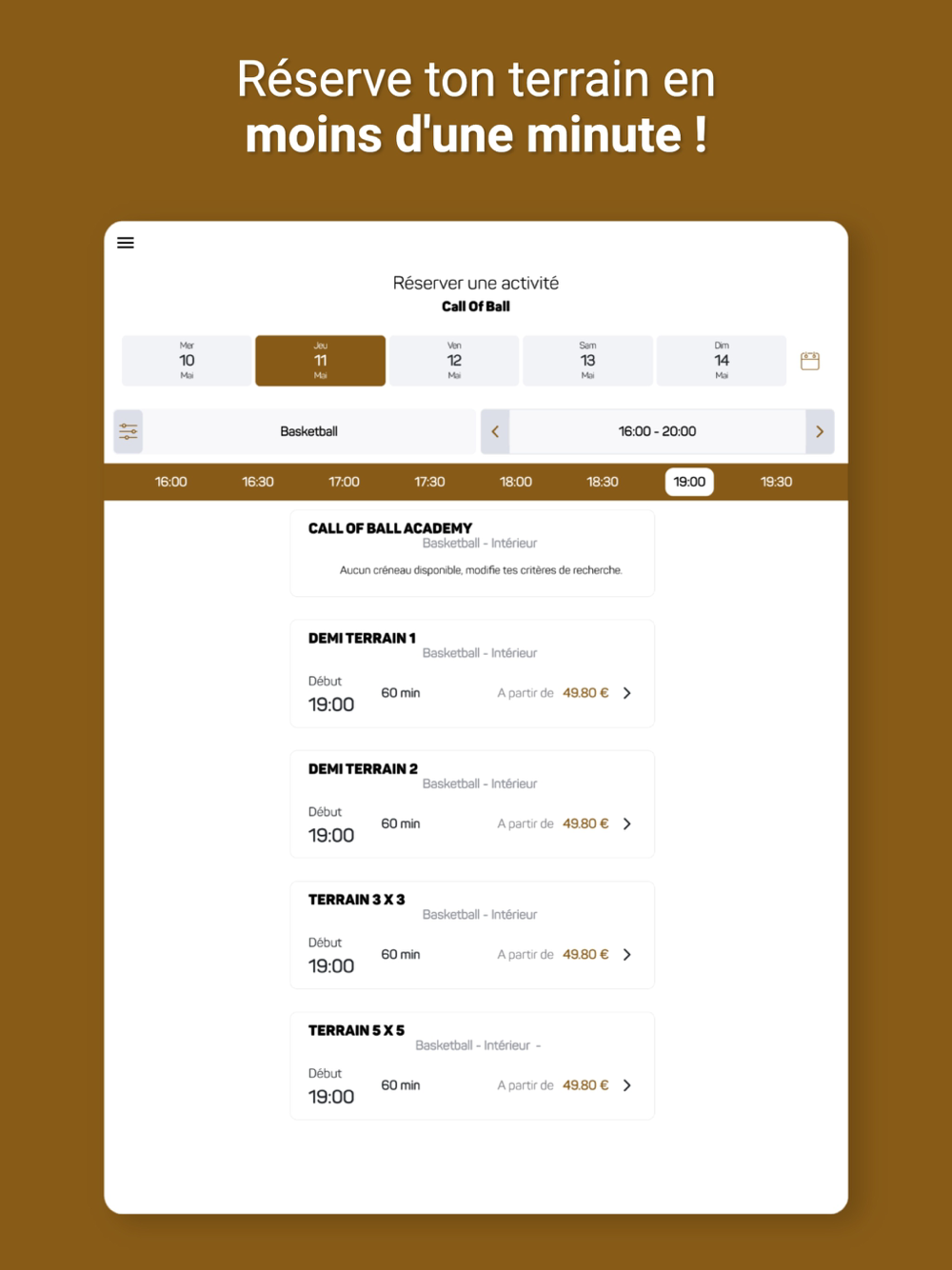 Fini la corvée de réservation ! Avec l'application tu n'as plus qu'à accéder aux créneaux disponibles et à en choisir un. Le club recevra alors automatiquement ta réservation.