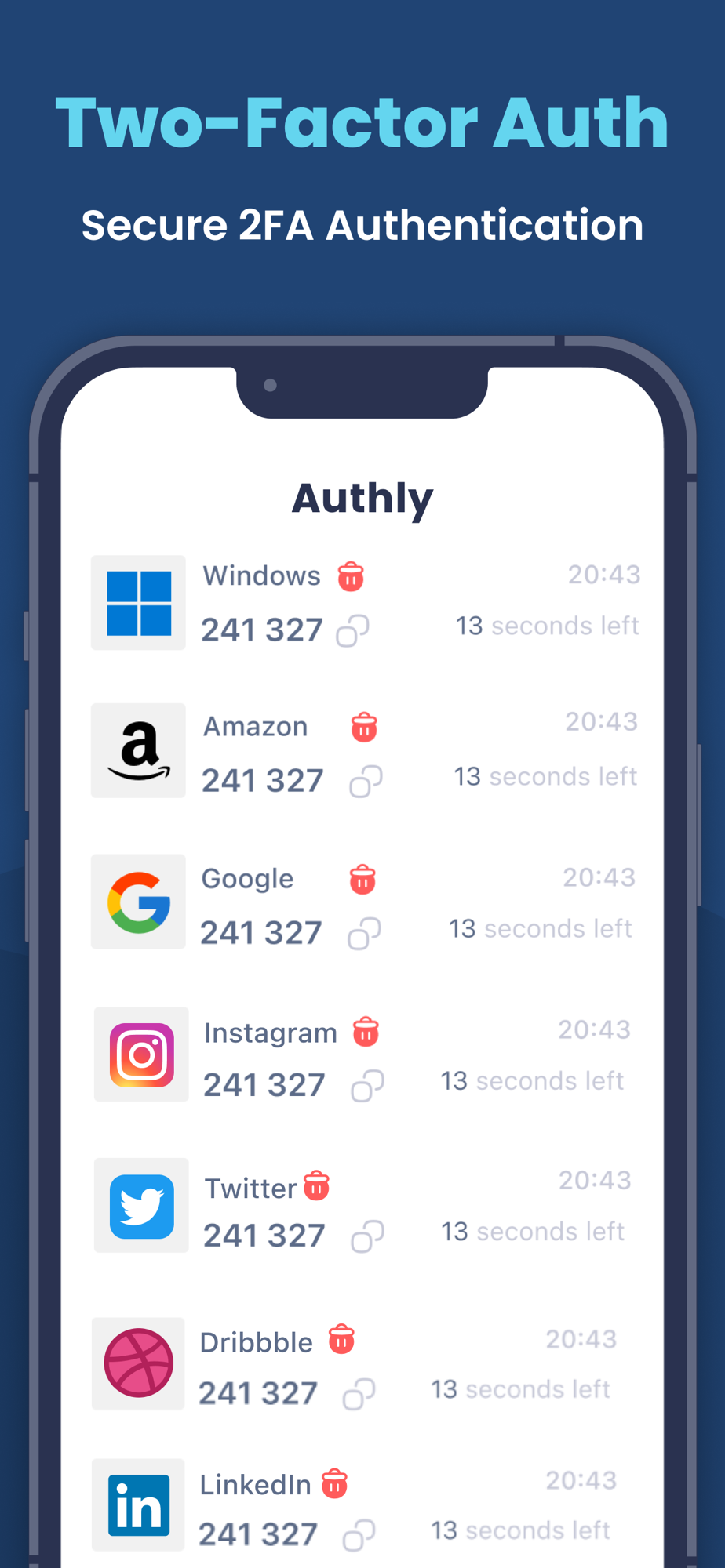 Authly is compatible with more than 2.500 websites and services including; Microsoft, Google, Salesforce, Robinhood, Facebook, PayPal, Amazon, Steam, Duo Mobile, Coinbase, Twilio, Binance, Authy, Twitter, Blizzard, Dropbox , Battle.net, ID.me, Snapchat, Discord and thousands more.
