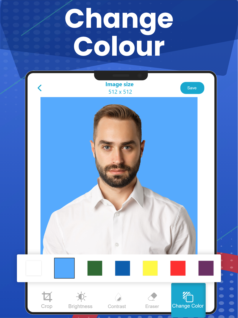 Passport size photo maker have professional editing tools like change Background, White Balance, Brightness, Contrast, Saturation, and much more.