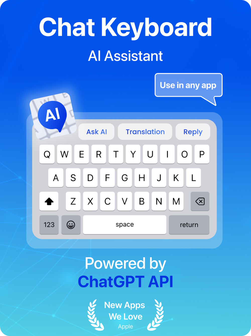 Chat Keyboard AI Assistant is a new free writing keyboard ai assistant app for your phone. Use it in any app with your keyboard instantly as ai assistant. Keyboard AI makes it easier for ai writing, get answer from ai, ai assistant & personal assistant, grammar check, paragraph writer and ai writer. Chat Keyboard AI Assistant is powered by Chat GPT API.