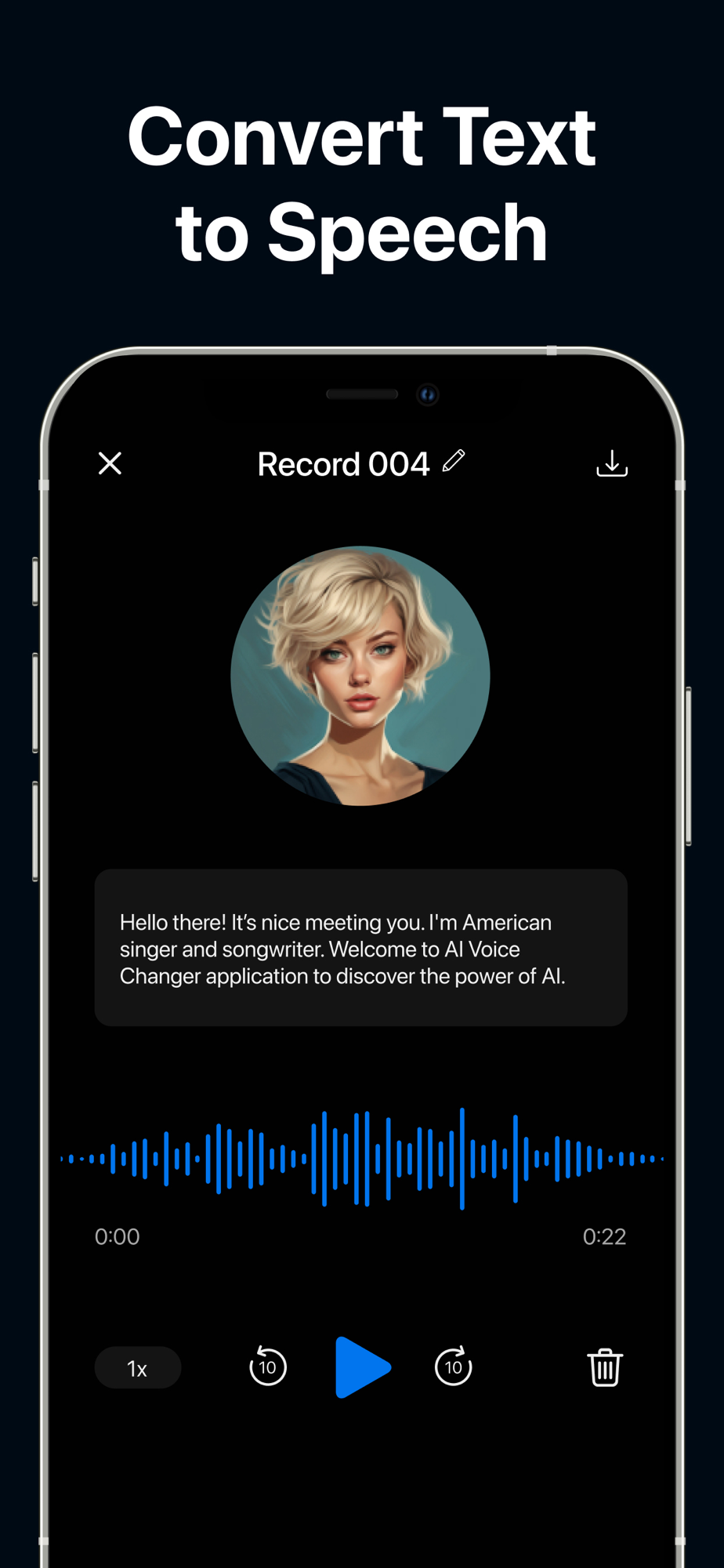 AI Voice Changer uses the latest AI technology to convert any text into realistic voice. You can create super realistic audio from any text by using AI Voice Changer app. Simply enter a text, choose a voice and let AI Voice Changer to turn text into speech with the latest AI Voice Changer model.