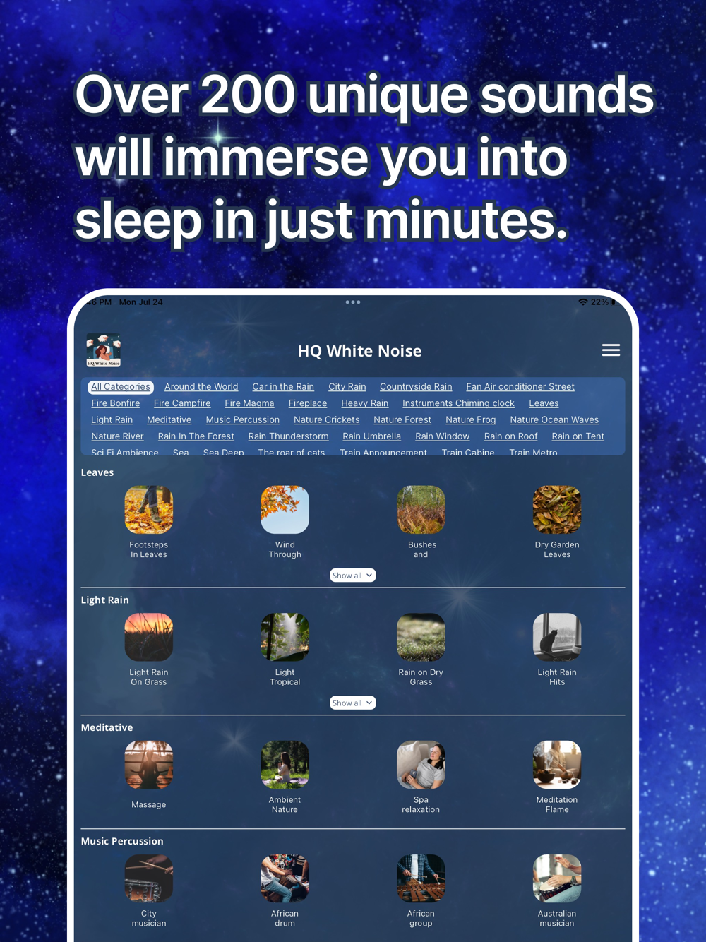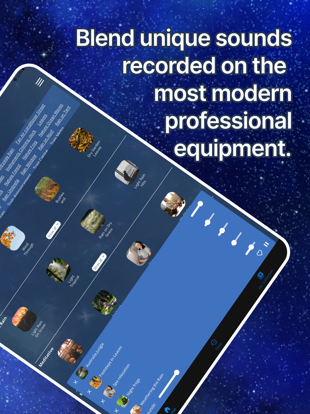 Struggling with insomnia or simply looking to elevate your sleep quality? The solution is simple: our app. Envision over 200 distinct sounds, each capable of drawing you into a restful slumber in mere moments. These sounds, captured on cutting-edge equipment, are tailored to fine-tune your brain into relaxation. Craft your ideal soundscape by merging them together, granting yourself the prospect of a perfect night. It's time to bid insomnia goodbye! Download and soothe your mind and soul with our sounds.