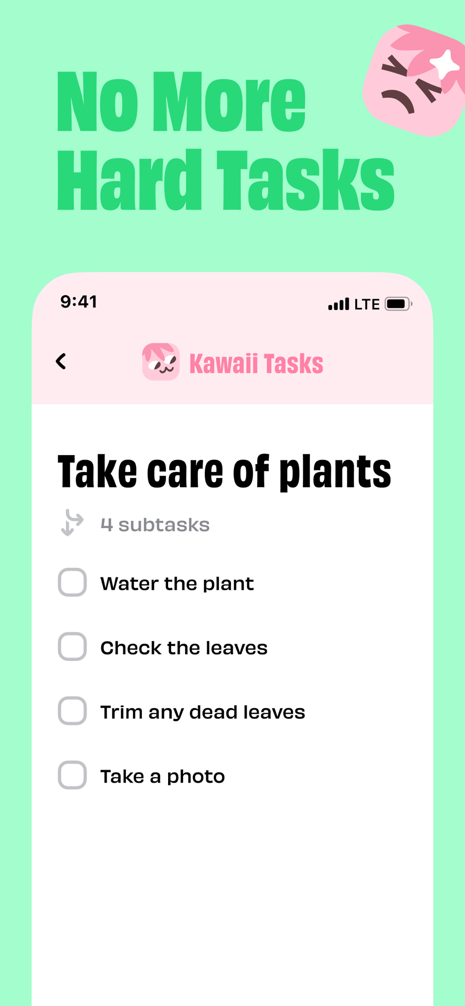 Breakdown your todos with Kawaii tasks. Tackle tasks you've been delaying by getting small, manageable subtasks.