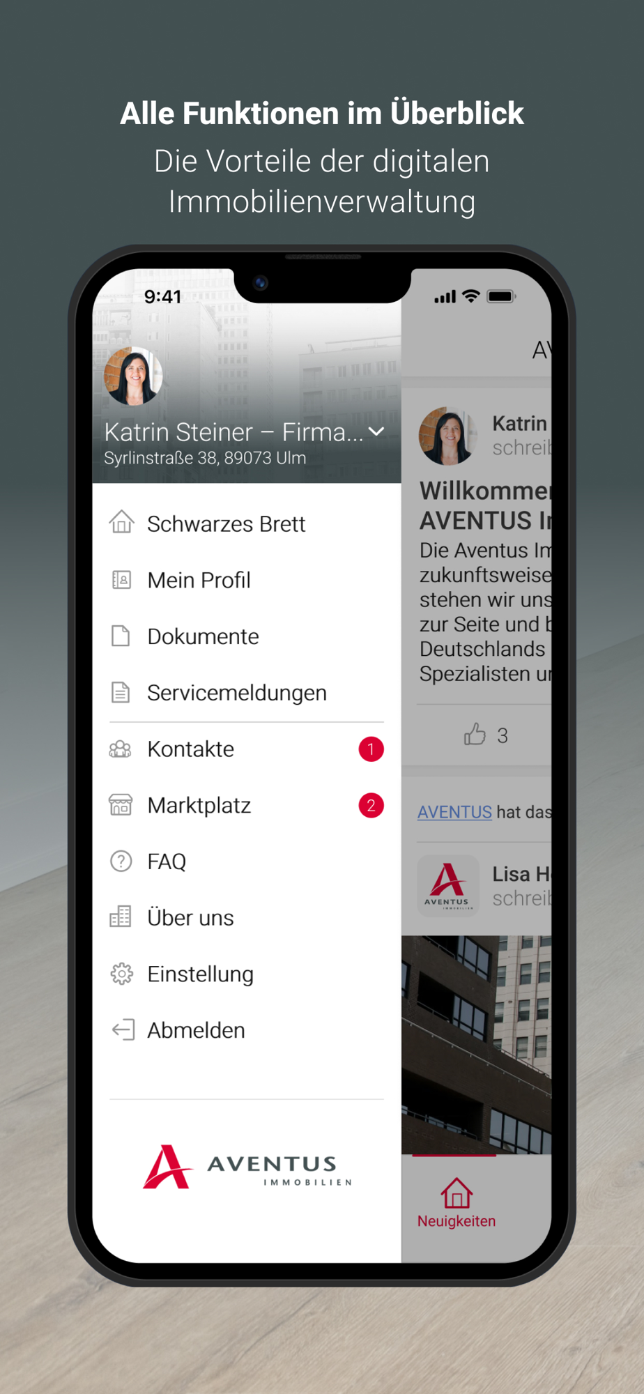 - Schnelle und effiziente Kommunikation: In unserer AVENTUS Immo App finden Sie alle Informationen und Dokumentationen an einem Ort gebündelt – in Ihrer Hosentasche und jederzeit digital verfügbar