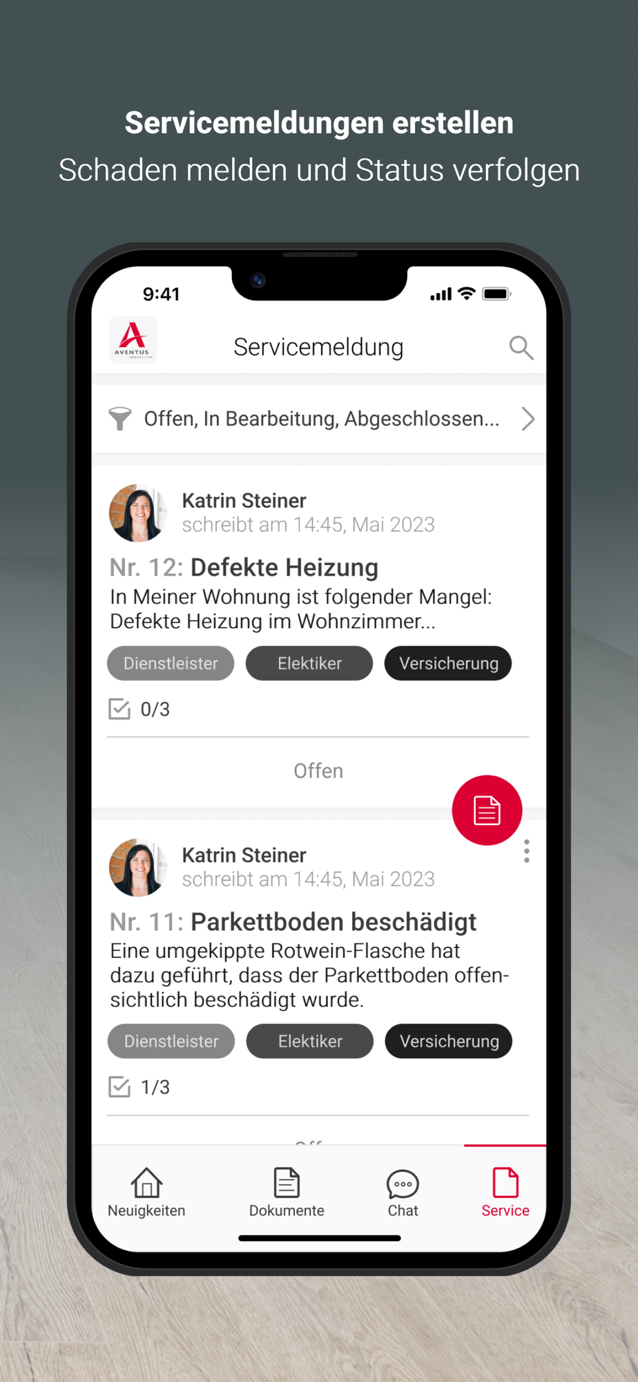 - Interaktiv: Sie können in der AVENTUS Immo App direkt Schadensmeldungen oder andere Anliegen mit Fotos erfassen. Ihr Sachverhalt wird schnell bearbeitet und Sie erhalten regelmäßige Status-Updates per Push-Nachrichten.