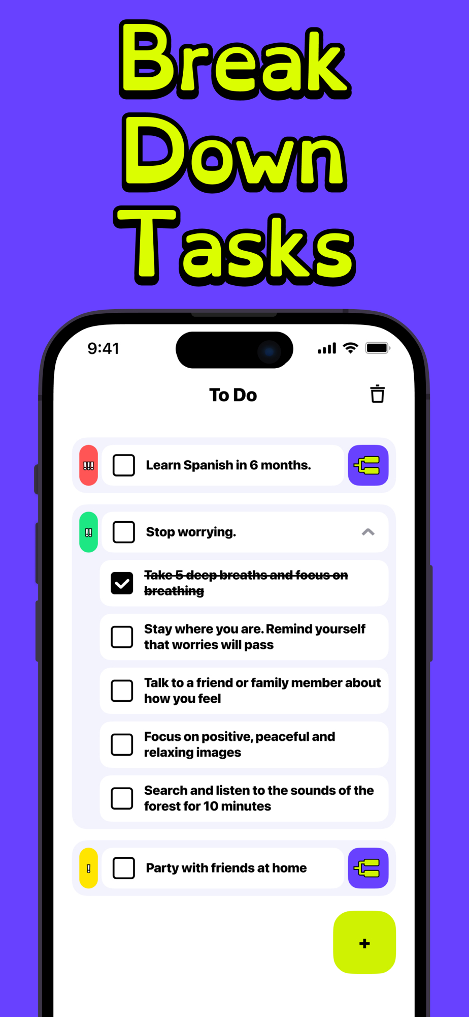 Assign each task its own color from the playful palette.