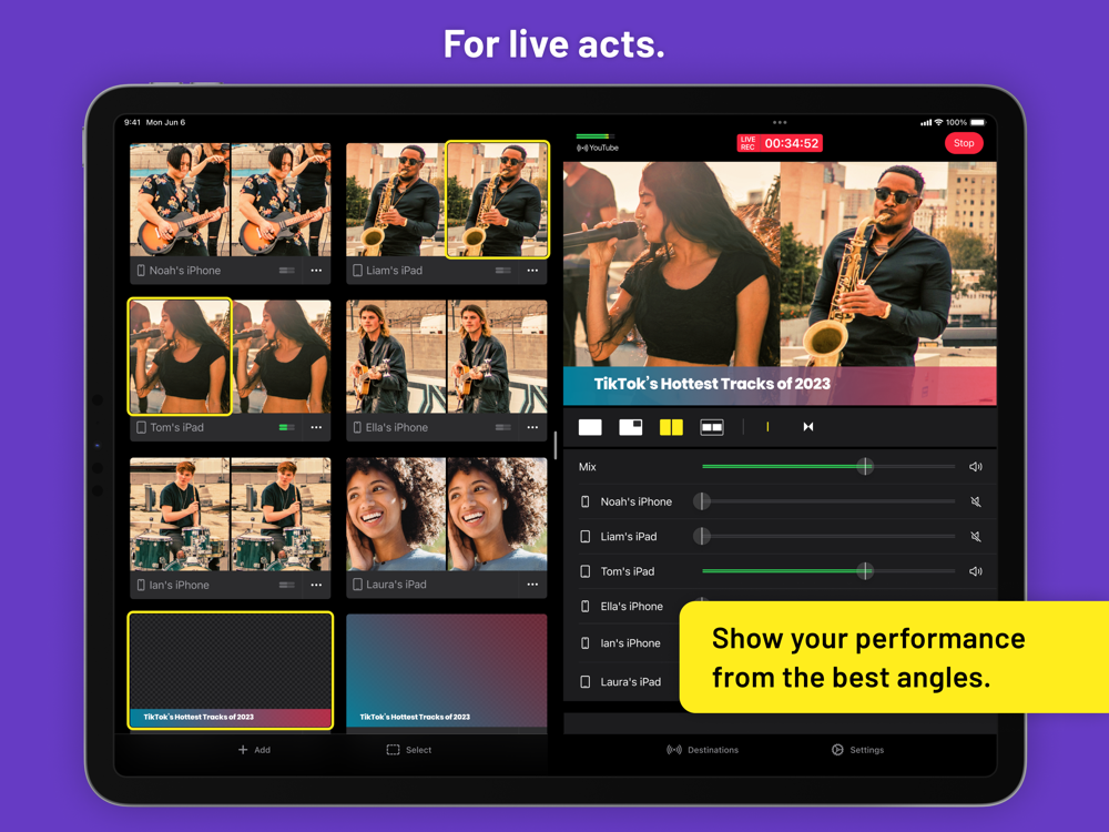 • Sync up to eight iPads or iPhones for multi-camera live productions