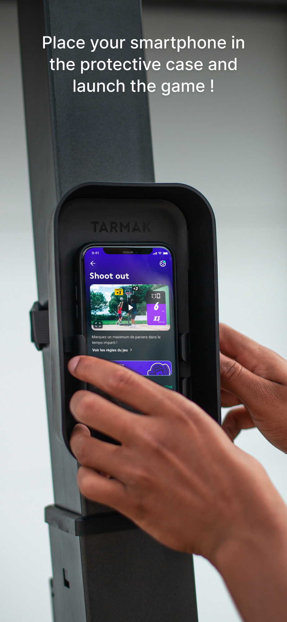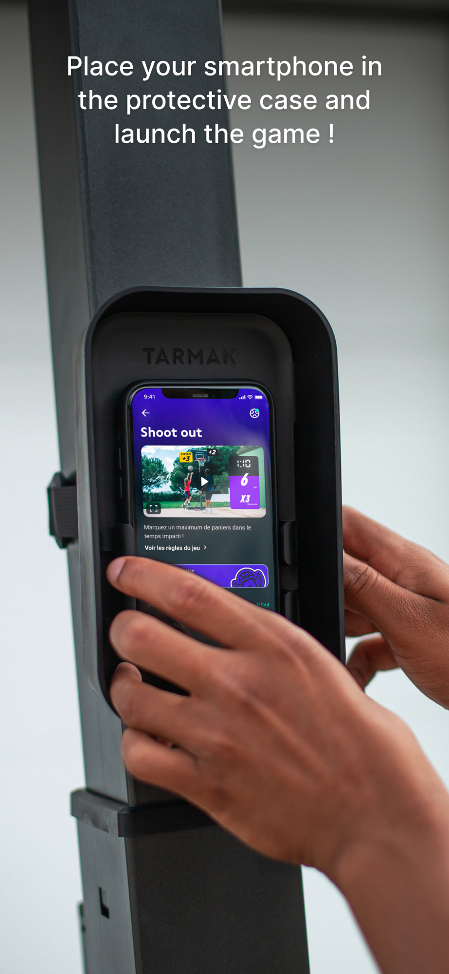Transform your smartphone into a live scoreboard while playing. Attach the smartphone case to the basketball system’s pole so the smartphone becomes a visual and sound interface while playing.