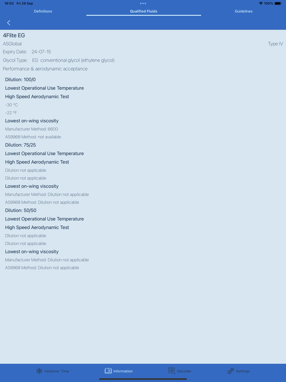 Contains the 4 generic fluid data based on the FAA, EASA and Transport Canada Holdover Time Guidelines.
