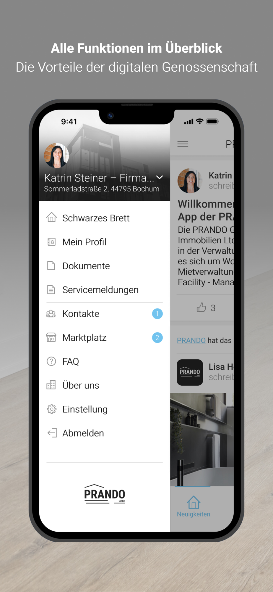 Als Kunde der PRANDO GmbH profitieren Sie von einem besonders innovativen Kundenservice, der Ihnen viele Freiheiten bietet. Mit der PRANDO App können Sie uns rund um die Uhr Anliegen und Schäden inklusive Fotodokumentation per Smartphone melden. Zusätzlich stellen wir Ihnen eine digitale Dokumentenmappe mit wichtigen Dokumenten für Ihre Immobilie zur Verfügung. Über das digitale schwarze Brett informieren wir via Push-Nachricht proaktiv über wichtige Informationen rund um das uns anvertraute Objekt.