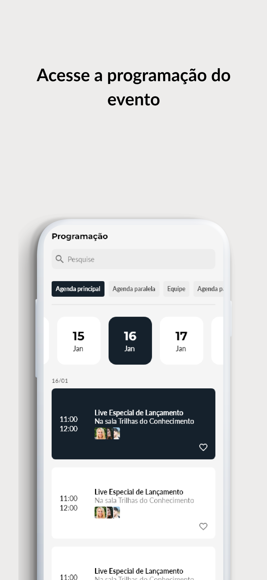 Com o aplicativo CONECTA EXPERIENCE, você tem acesso a uma rede social exclusiva, pode fazer novos contatos, enviar perguntas aos palestrantes, trocar mensagens com outros participantes, enfim, interagir com a comunidade. Além disso, você pode consultar a programação, avaliar conteúdos, dar feedback e responder quizzes. Utilize o APP e aproveite ao máximo os recursos.