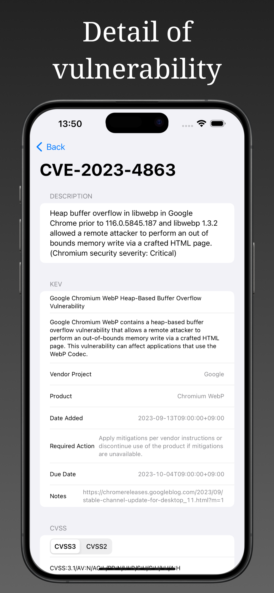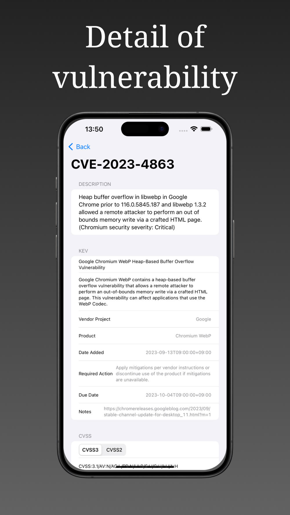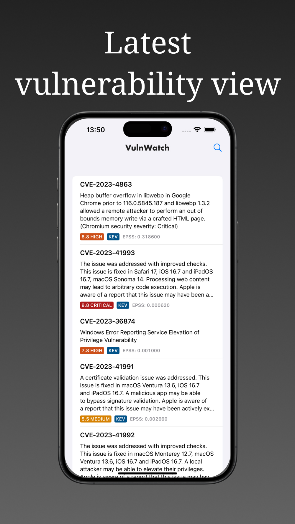 VulnWatch is an application designed to provide up-to-date and reliable security information. We aggregate vulnerability information from the NVD (National Vulnerability Database) and CISA (Cybersecurity & Infrastructure Security Agency) and put it in the palm of your hand.Using VulnWatch VulnWatch will eliminate your digital security concerns and give you easy access to all the latest information.