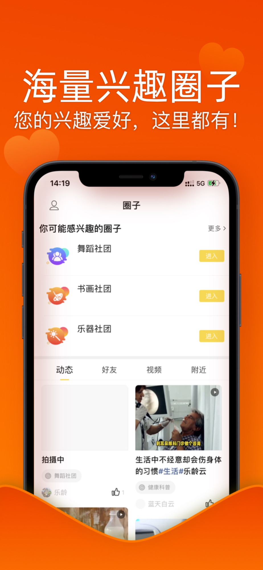 乐龄无忧注于为老年人提供社交、情绪价值、 兴趣教育、兴趣活劢、兴趣比赛、主题游学、健康医疗等全方位退休后多元化服务的创新型企业,致力于 通过丰富的活劢形式和个性化的定制方式,满足老年 人在生活、健康、文化、艺术、科技等方面的需求。在软件中,还有专属的兴趣社交,这里有非常多志趣相投的小伙伴,赶紧来与他们交流互动吧。