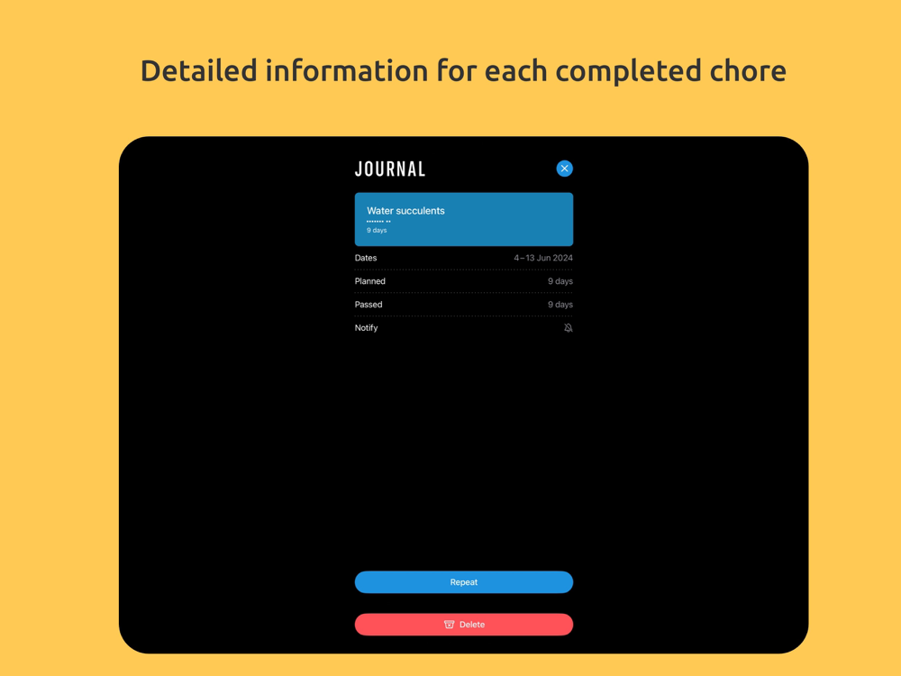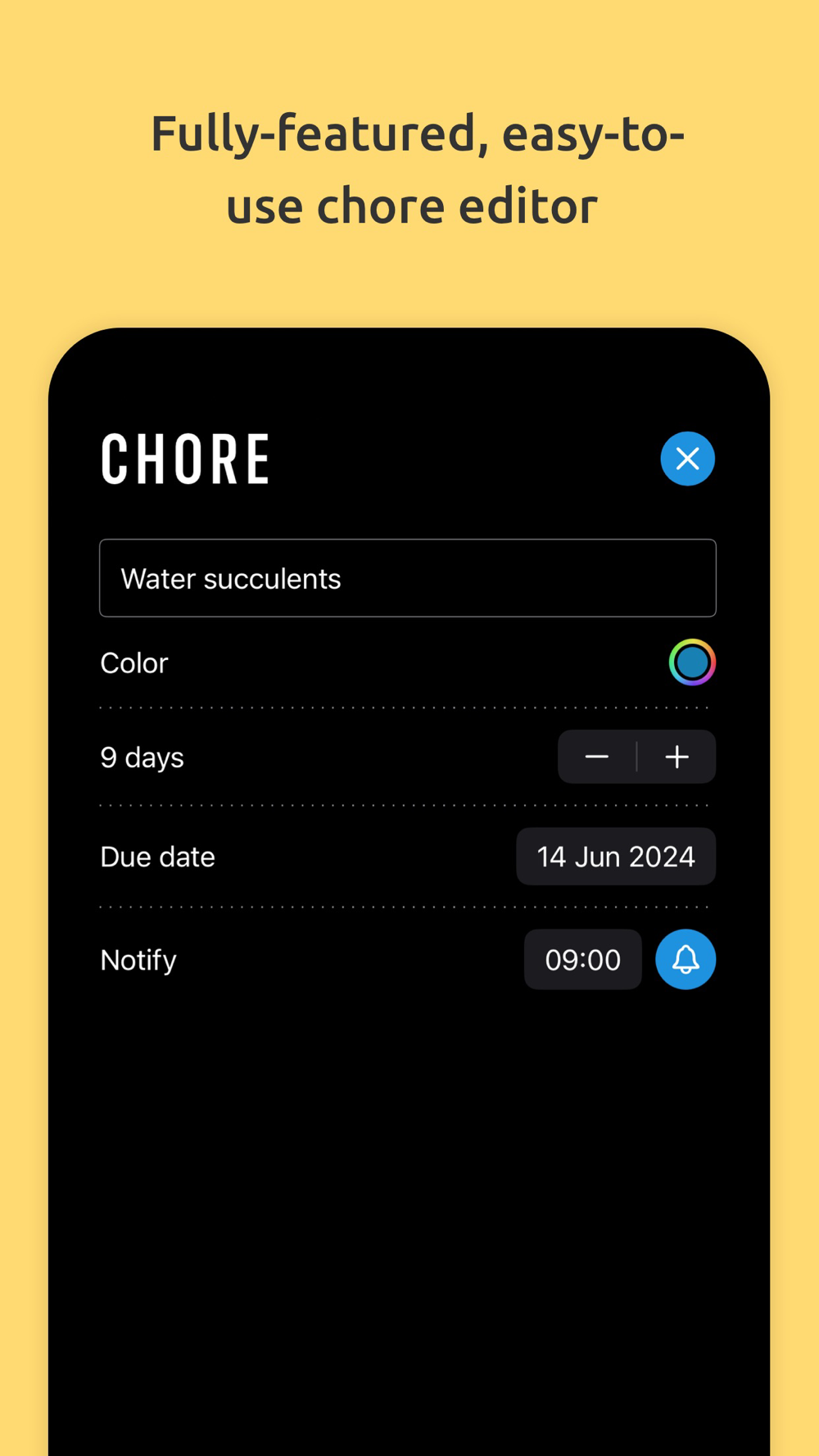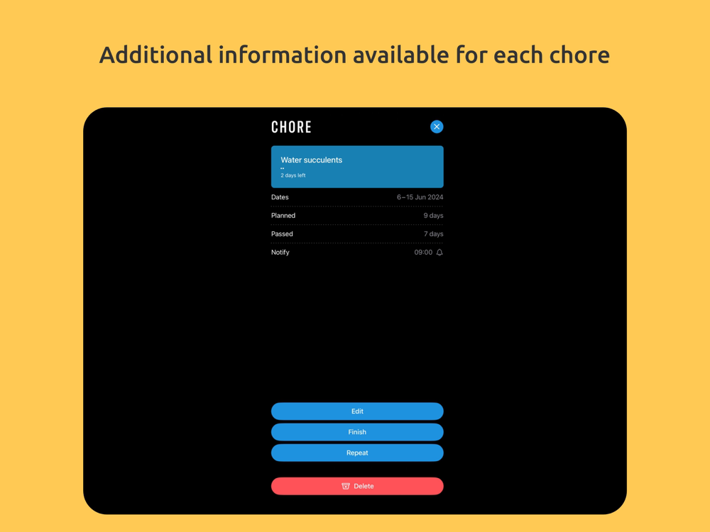 Instead of rigid schedules, Choreissimo tracks chores based on when they were last done. This way, your chores adapt to your life, not the other way around.