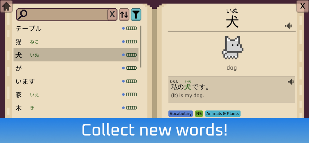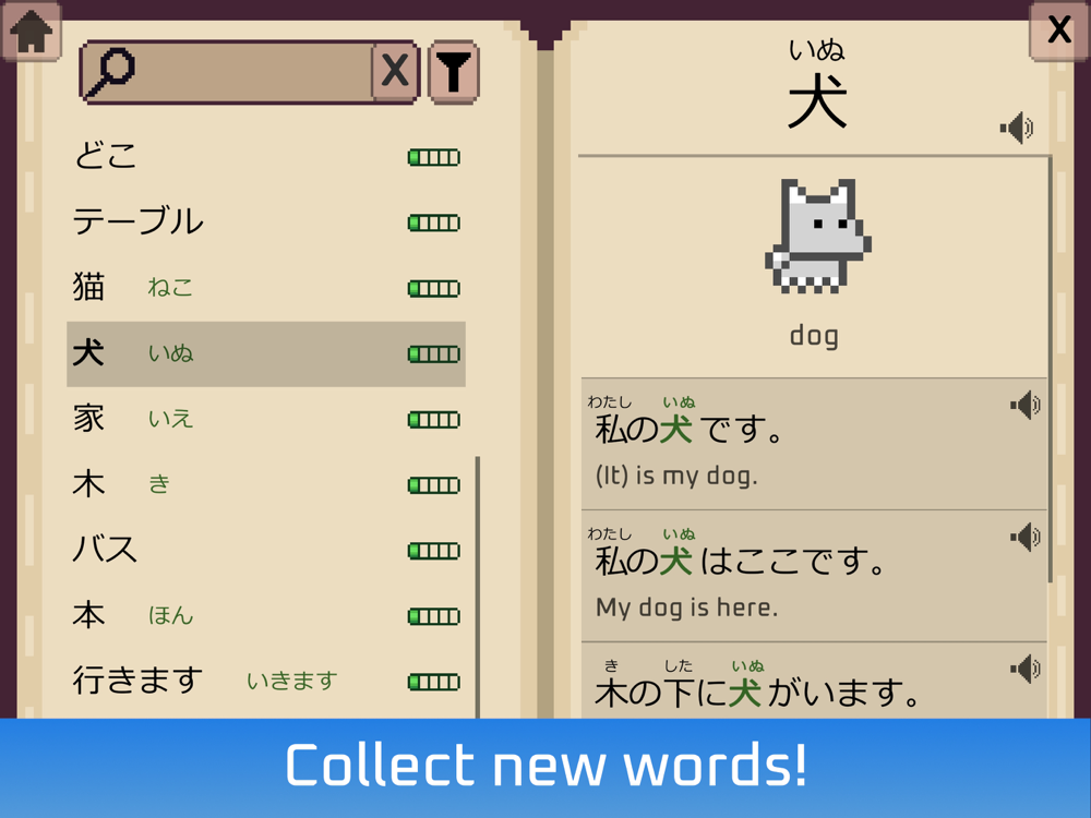 ◆ COLLECT new words, Kana, Kanji and get detailed explanations on grammar patterns and conjugation step-by-step. No more overwhelming Kana / Kanji / vocabulary lists.