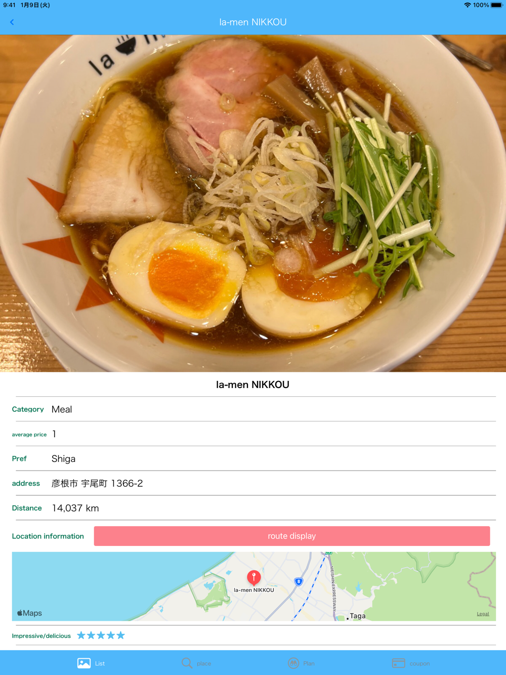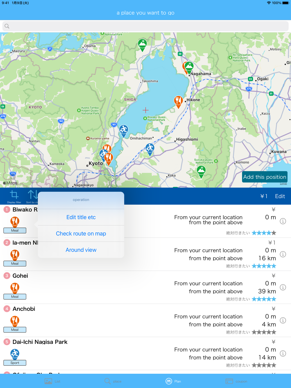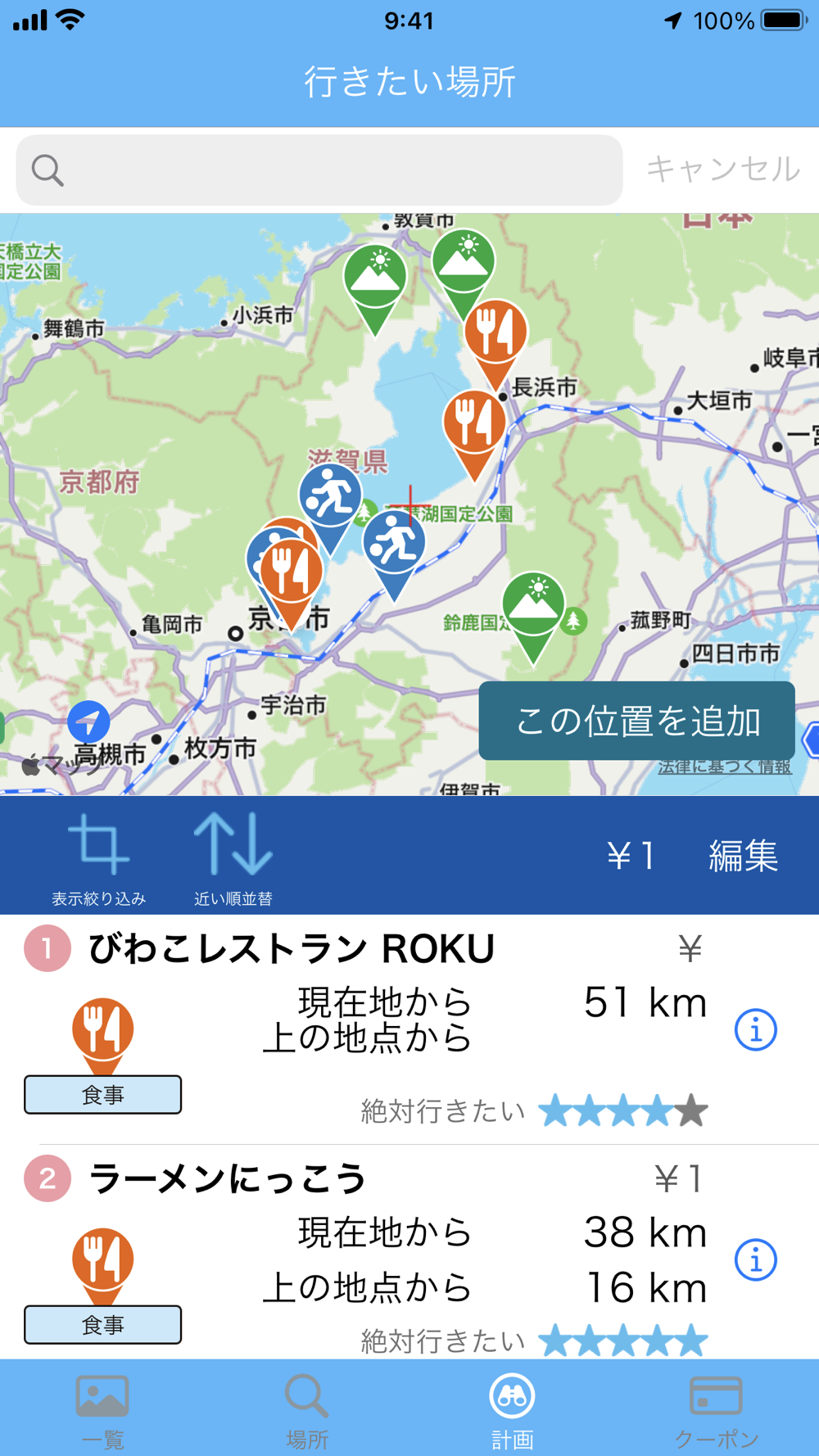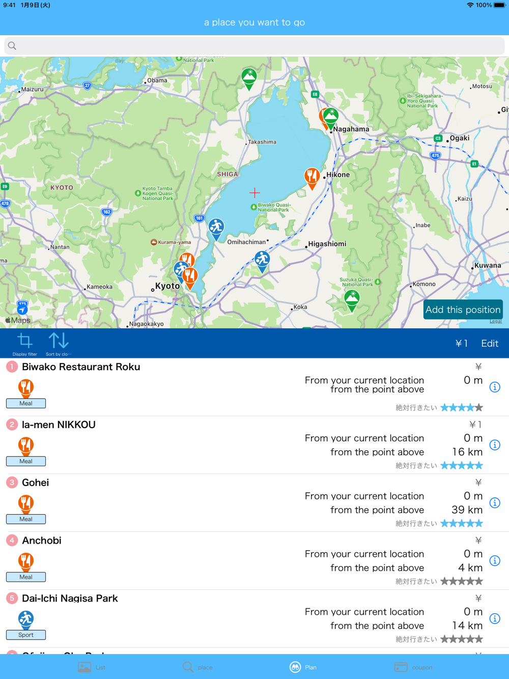 The list of places you want to visit can be displayed in order of distance from your current location, making it easy to plan your trip.