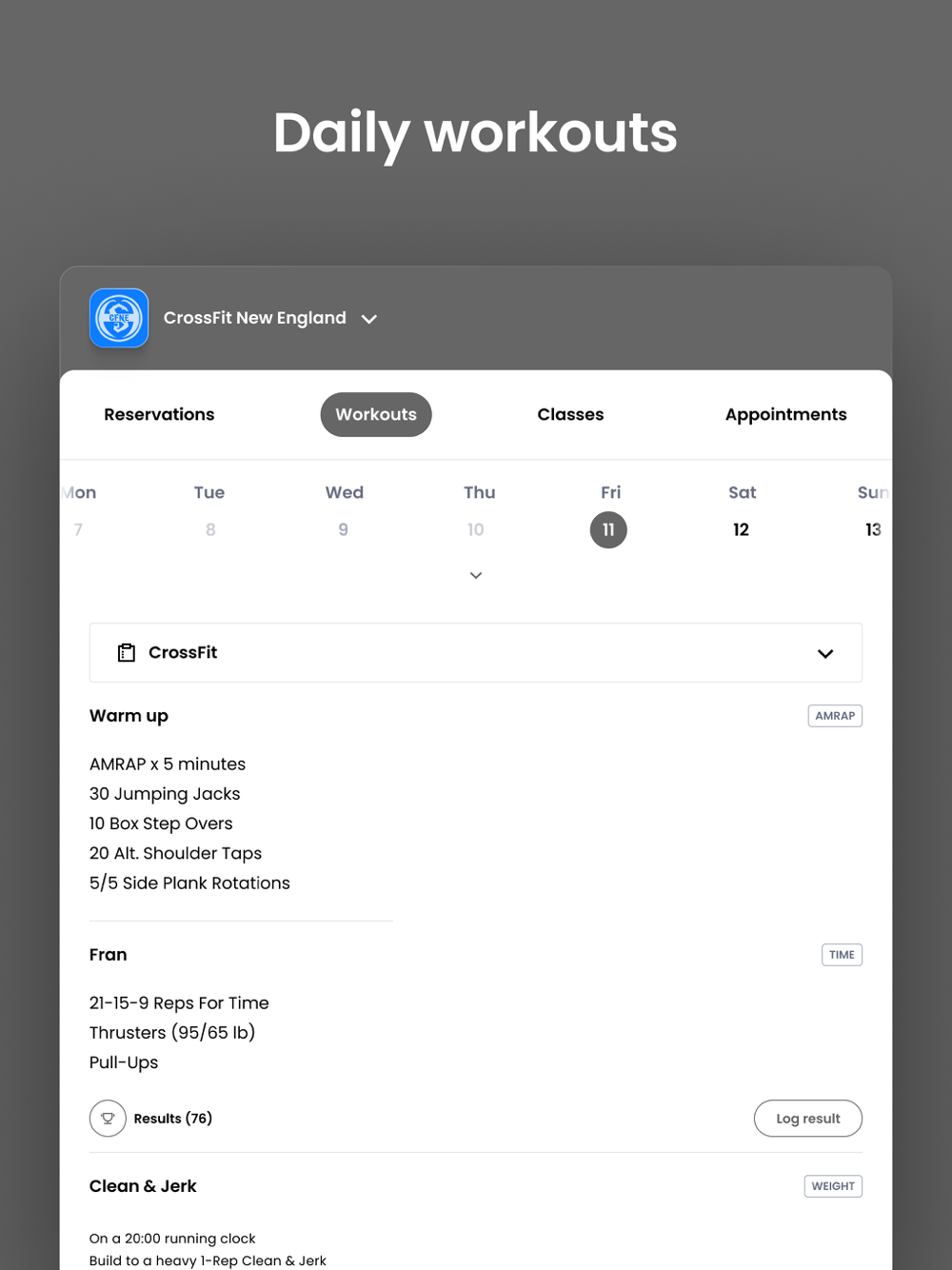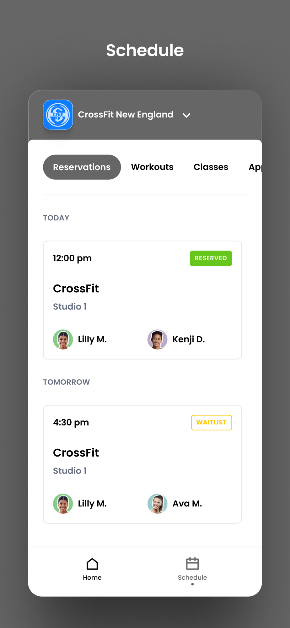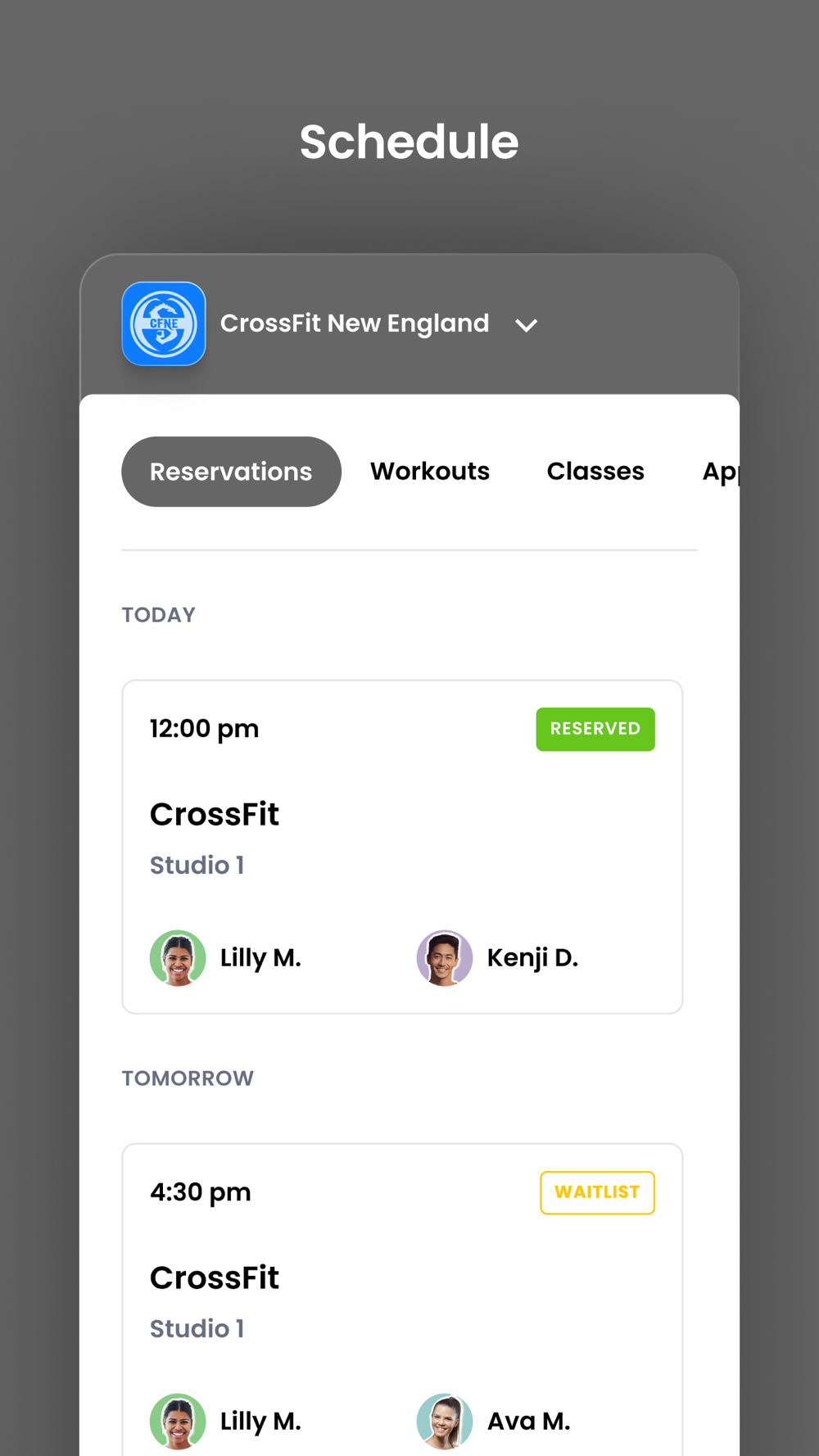 For members of CrossFit New England to reserve their place in a class, sign up for gym events, and general account management like updating headshots and credit card on file.