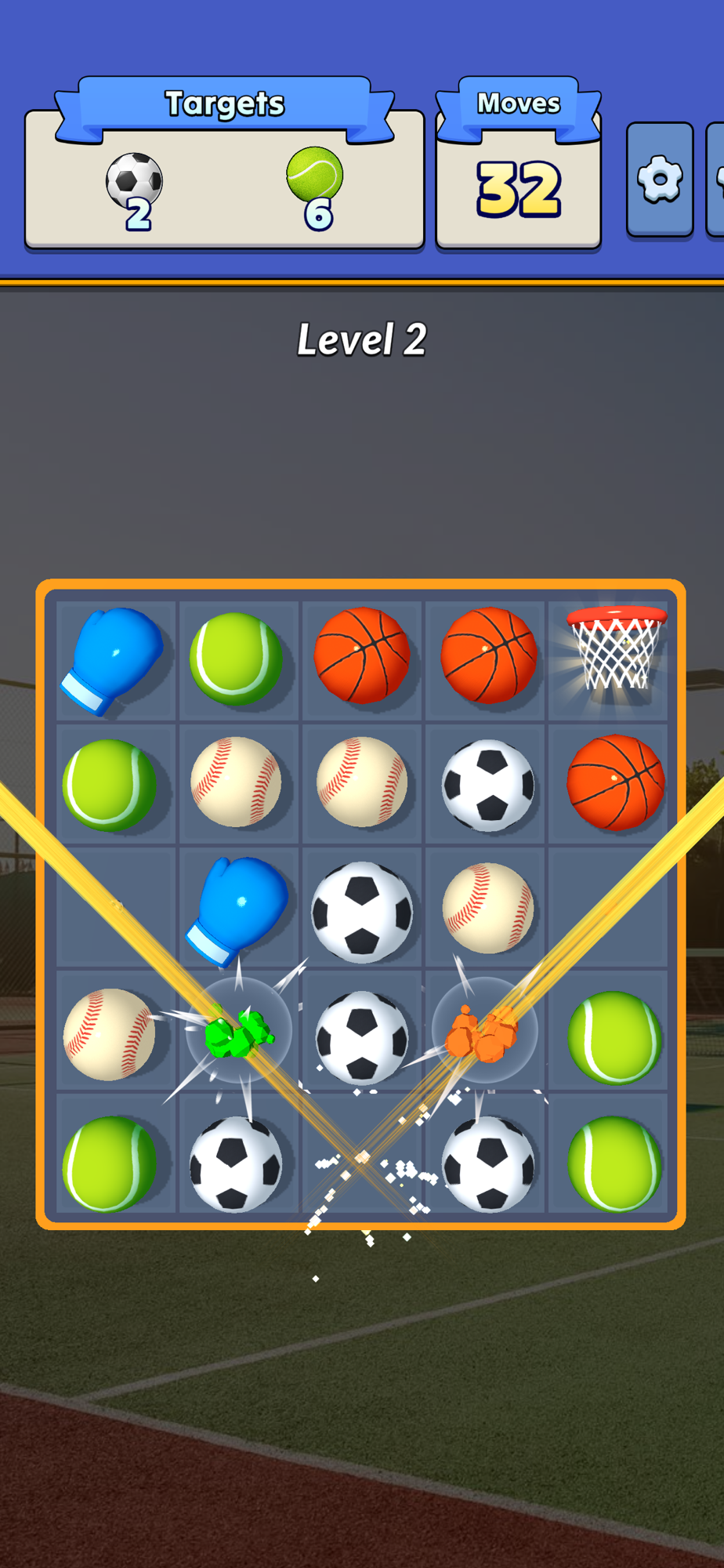 Classic match-3 gameplay with a sports twist. Players match sports items to clear the board and score points.