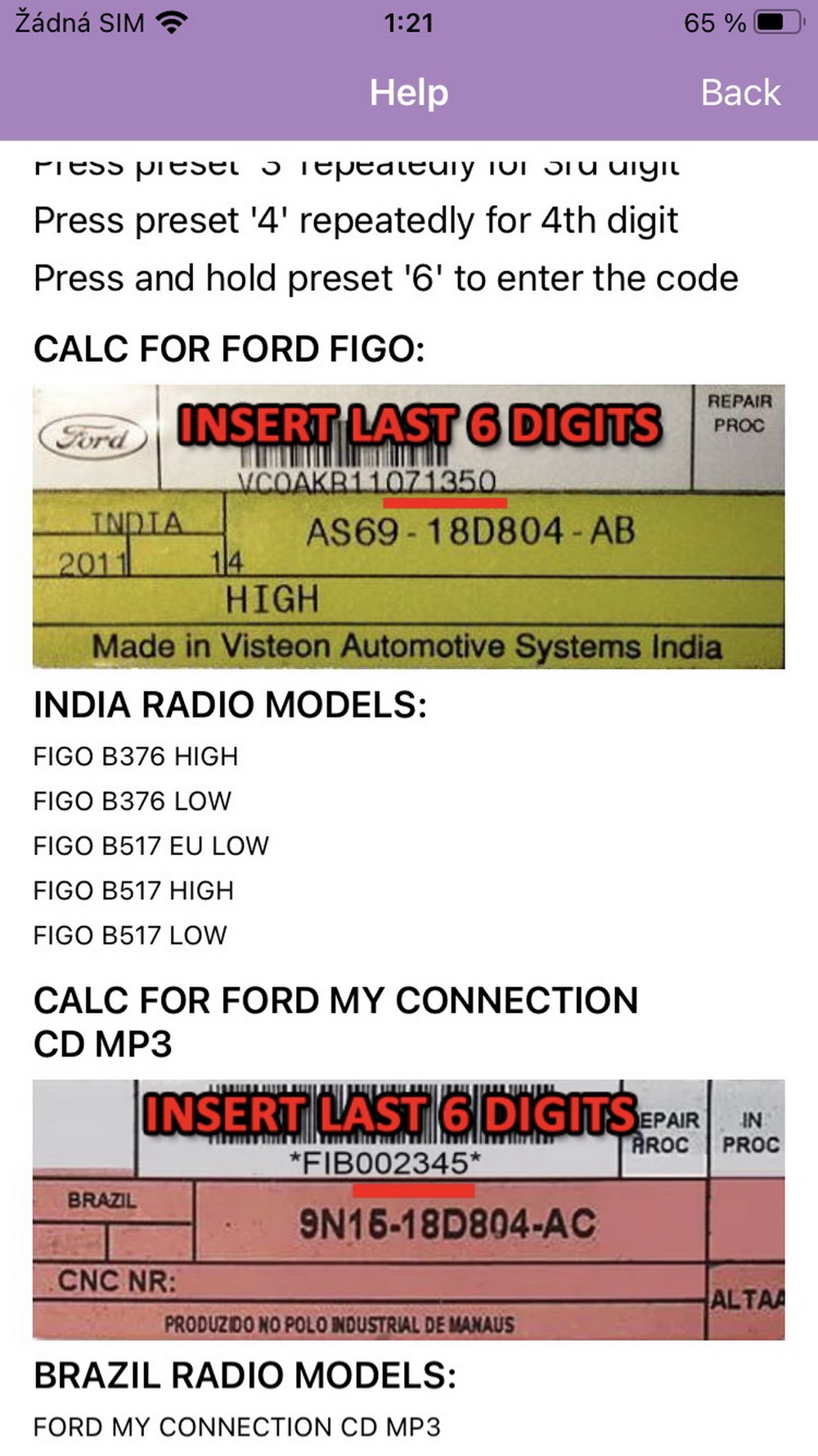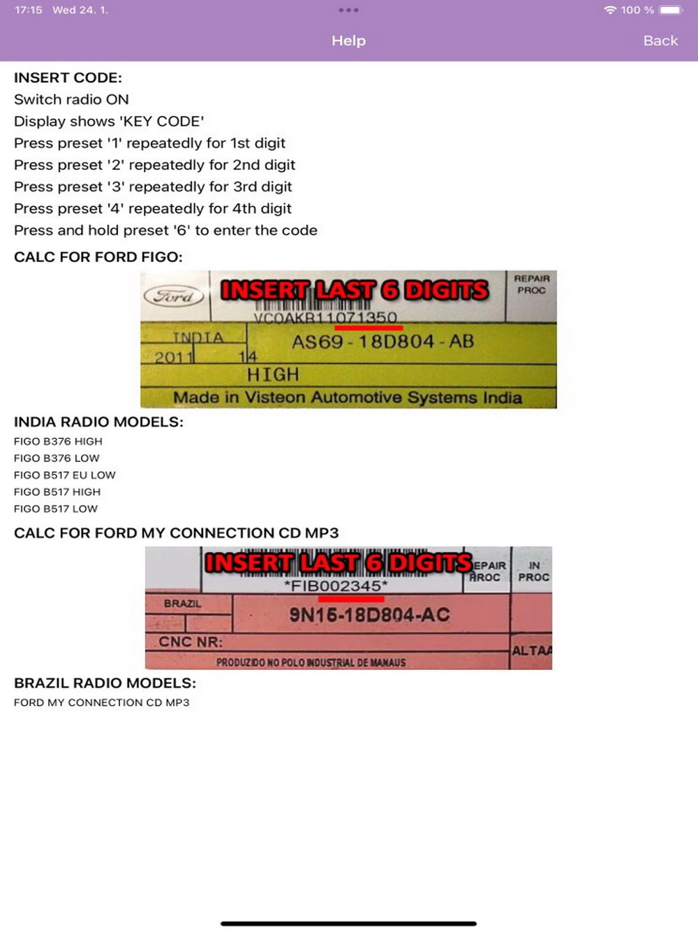 RADIO CODE GENERATOR for FORD FIGO INDIA FORD MY CONNECTION BRAZIL.