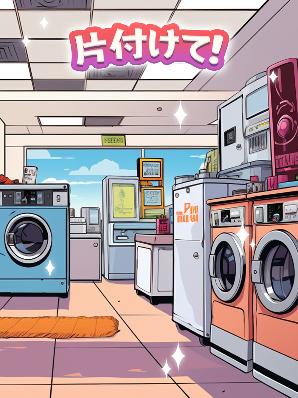 異なる部屋を片付ける喜びのために注意深くデザインされたシーン。