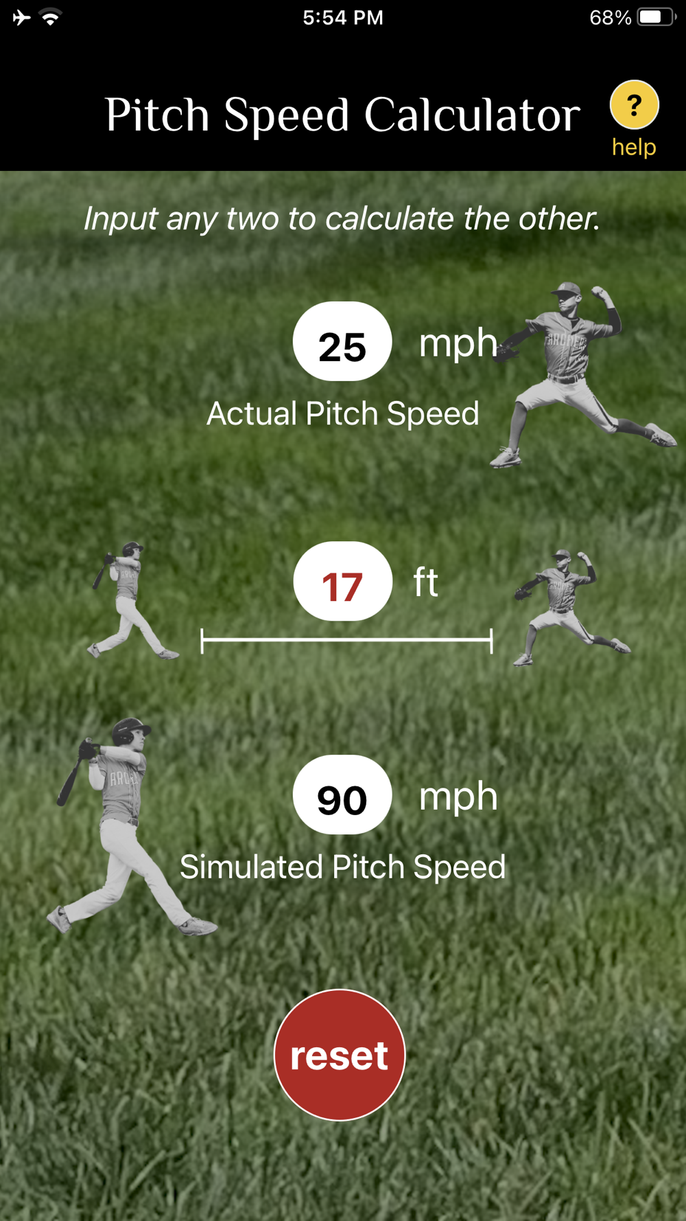 BPA allows input of any two of the three variables to calculate the other. Calculations are based on 60 feet, 6 inches. Calculations do not take into account pitcher’s stride lengths, release point of ball, etc.