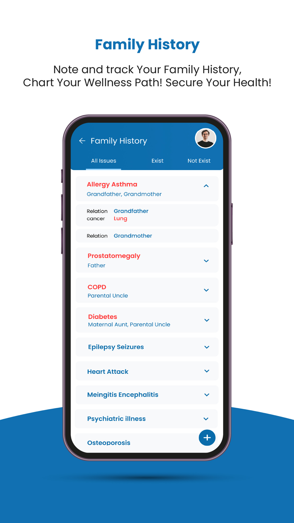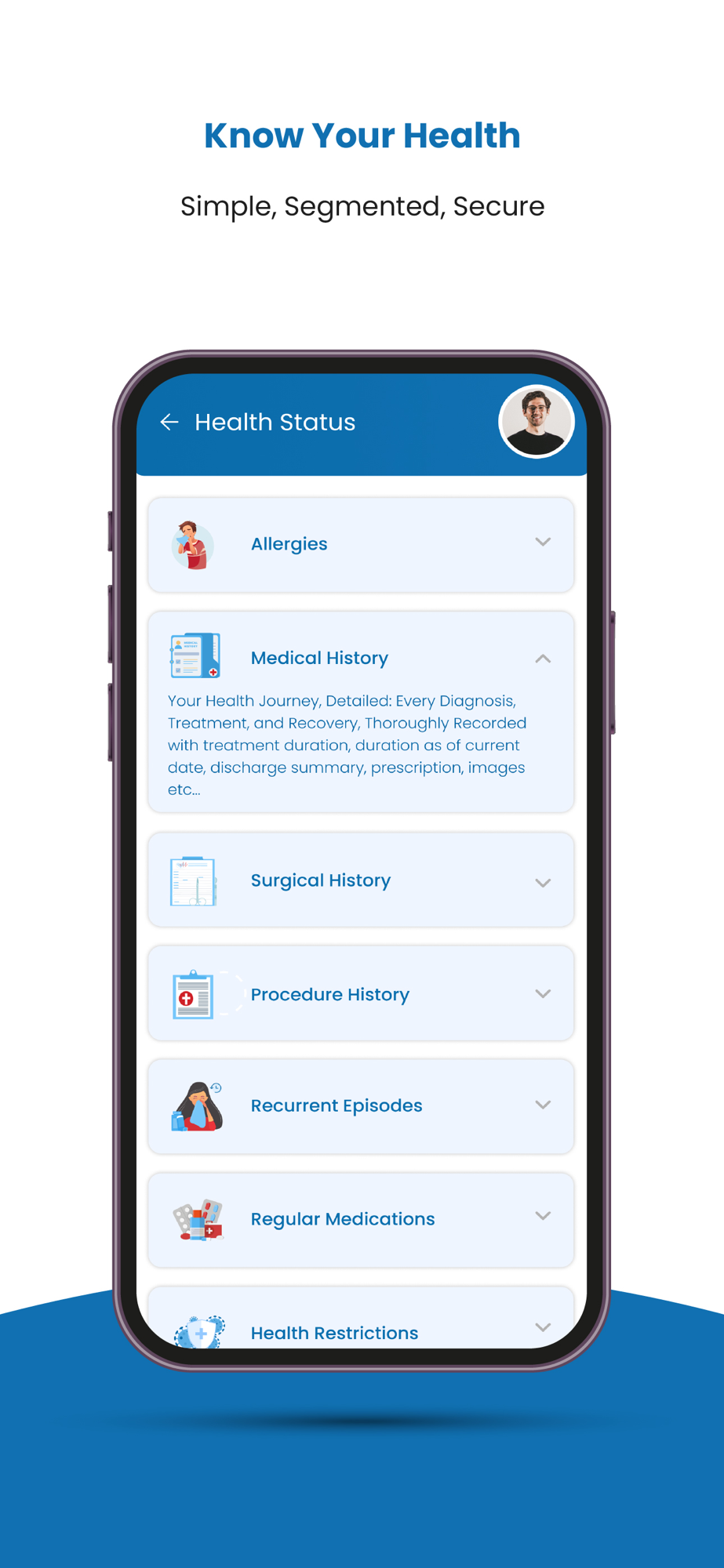 Health status: Keep track of allergies, medical history, surgical history, procedure history, and more. Everything is documented for easy access and management.