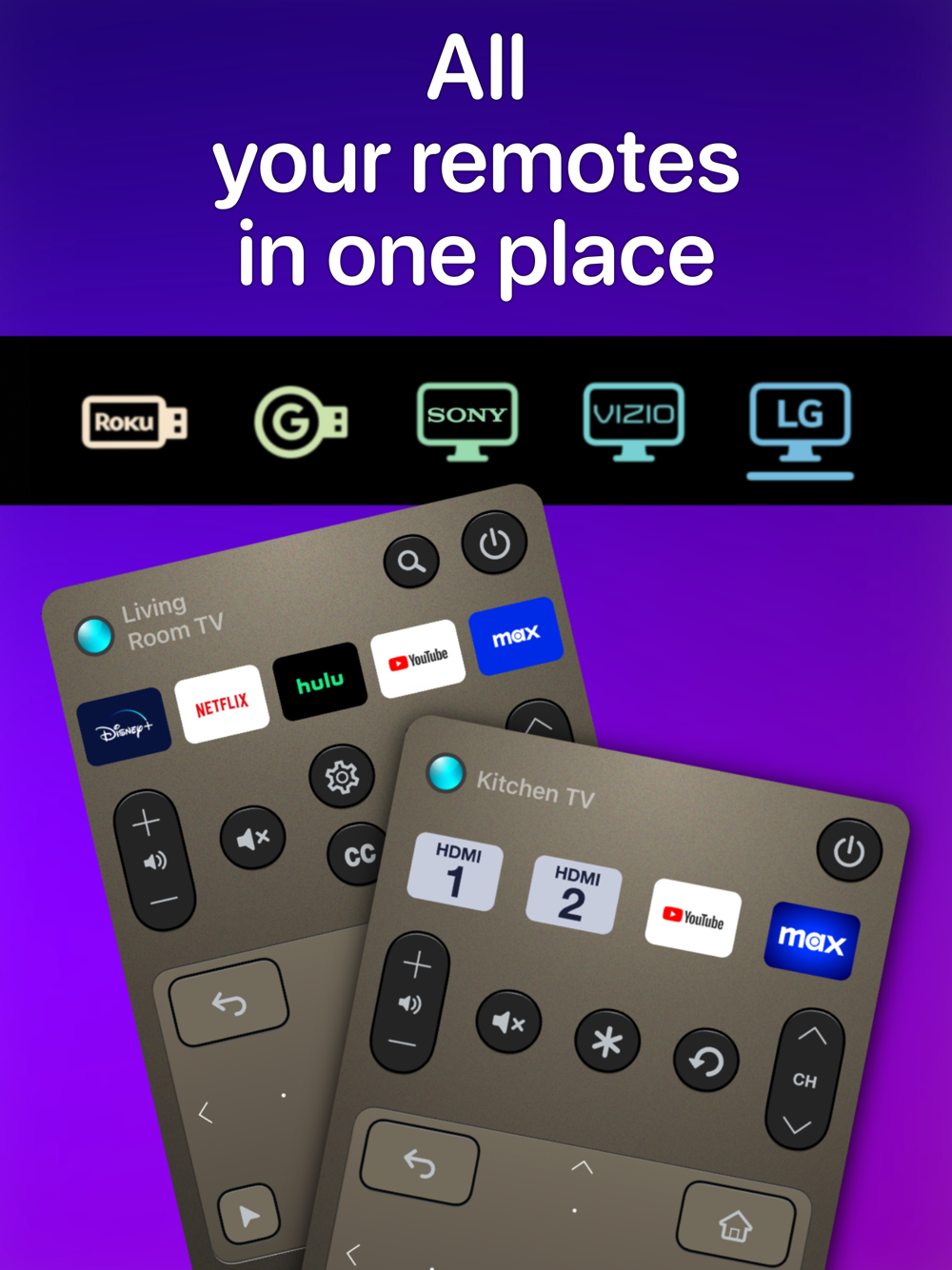 • Set up remote controls for multiple TV’s and streaming devices in one place. One tap switches between them.