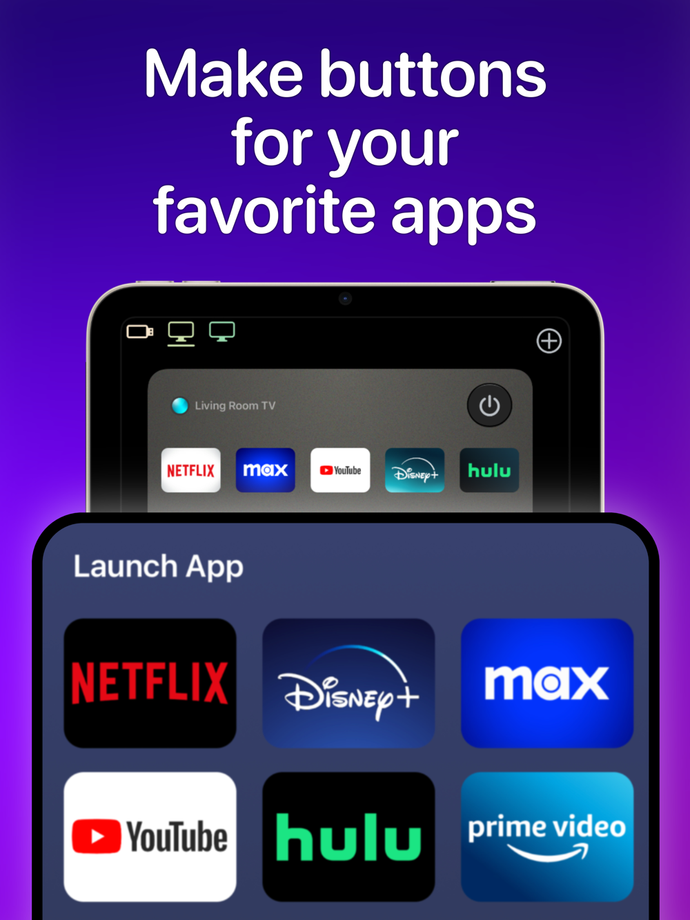 • Launch apps like YouTube, Netflix, Max, and Disney with one tap. Switch TV inputs/sources like HDMI1, HDMI2, or Antenna (“Live TV”).