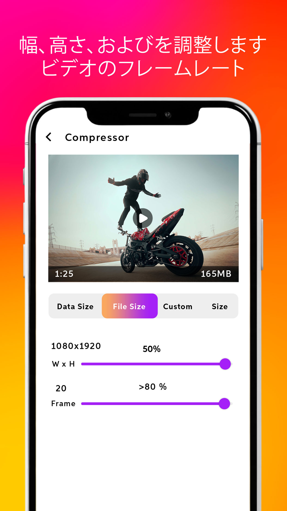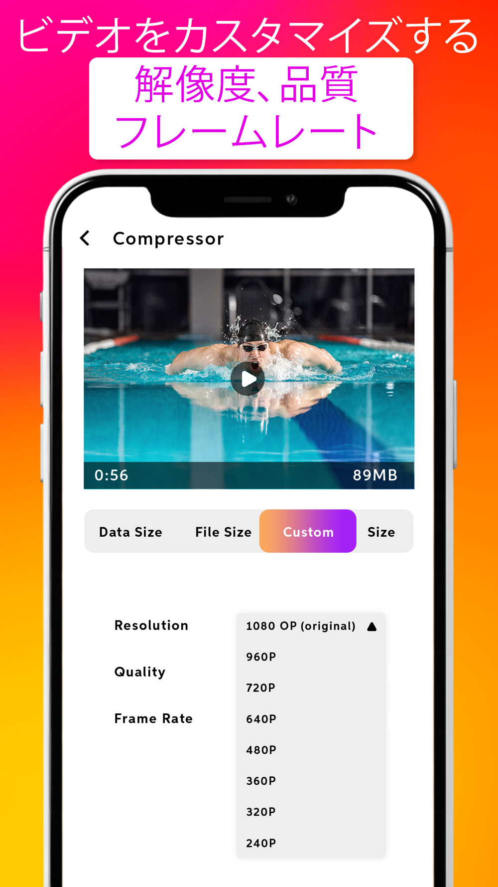 このビデオスリム化アプリは、ビデオサイズを簡単に削減し、適切な圧縮品質の解像度を取得するために、事前定義されたカスタム解像度、品質、フレームレートを備えています。
