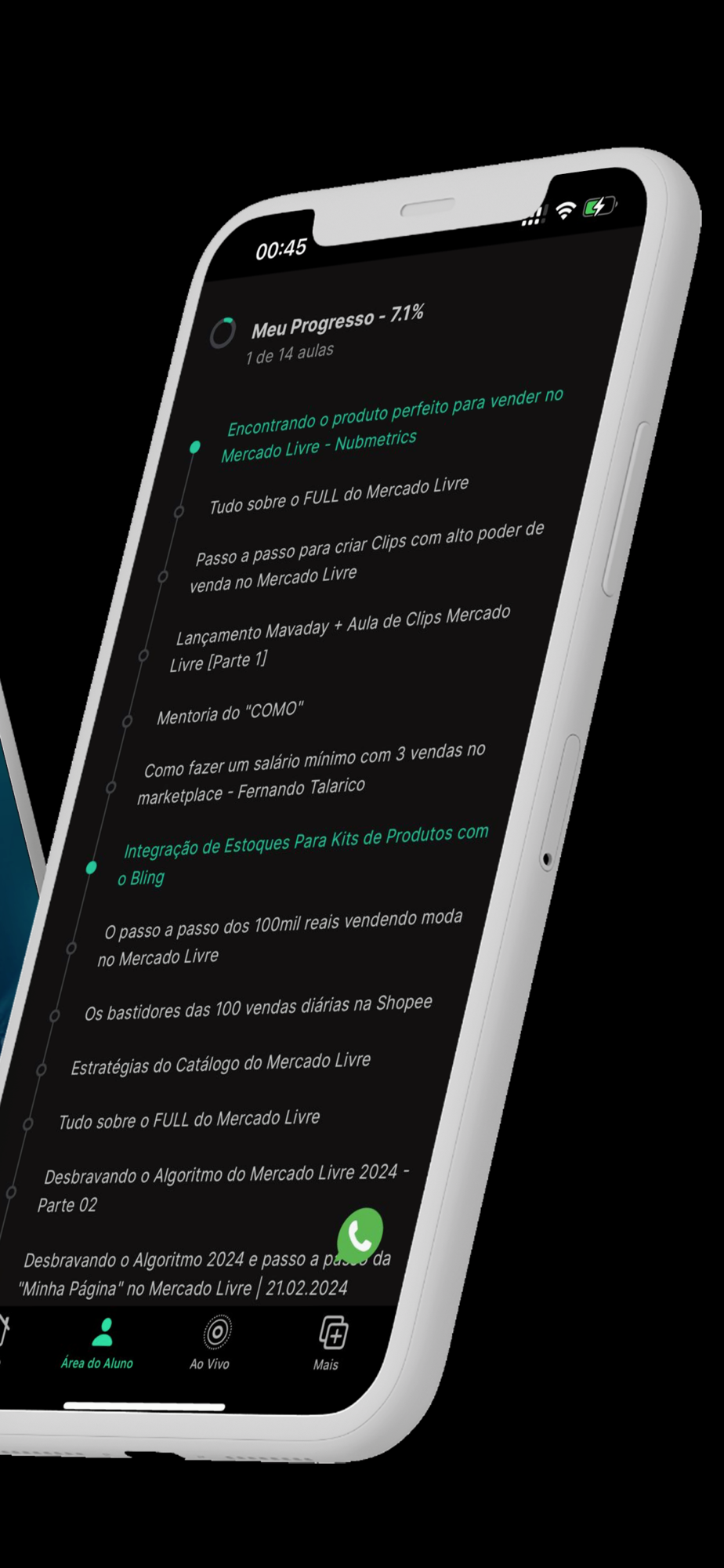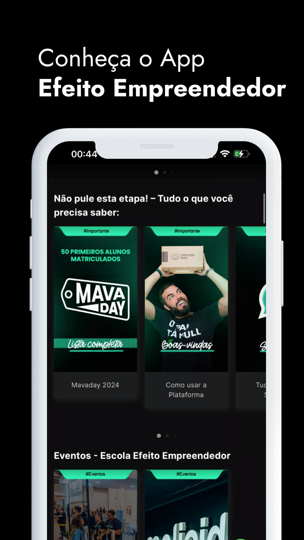 Efeito App é um aplicativo gratuito, com uma área de aulas públicas, lives e materiais, além da Área do Aluno, com treinamentos e conteúdos exclusivos de acordo com o curso adquirido.