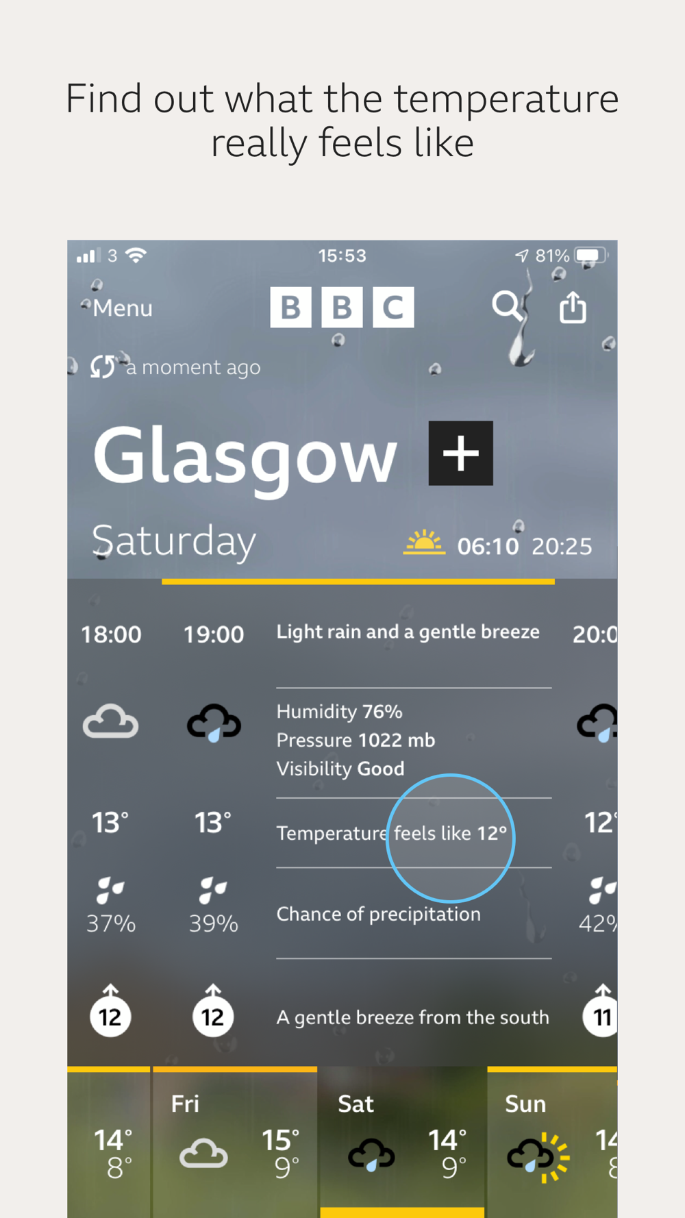 Wherever you are, and whatever your plans, you’re always prepared with the latest weather forecast from BBC Weather. Easy to understand, with hourly forecasts for tens of thousands of locations around the globe.
