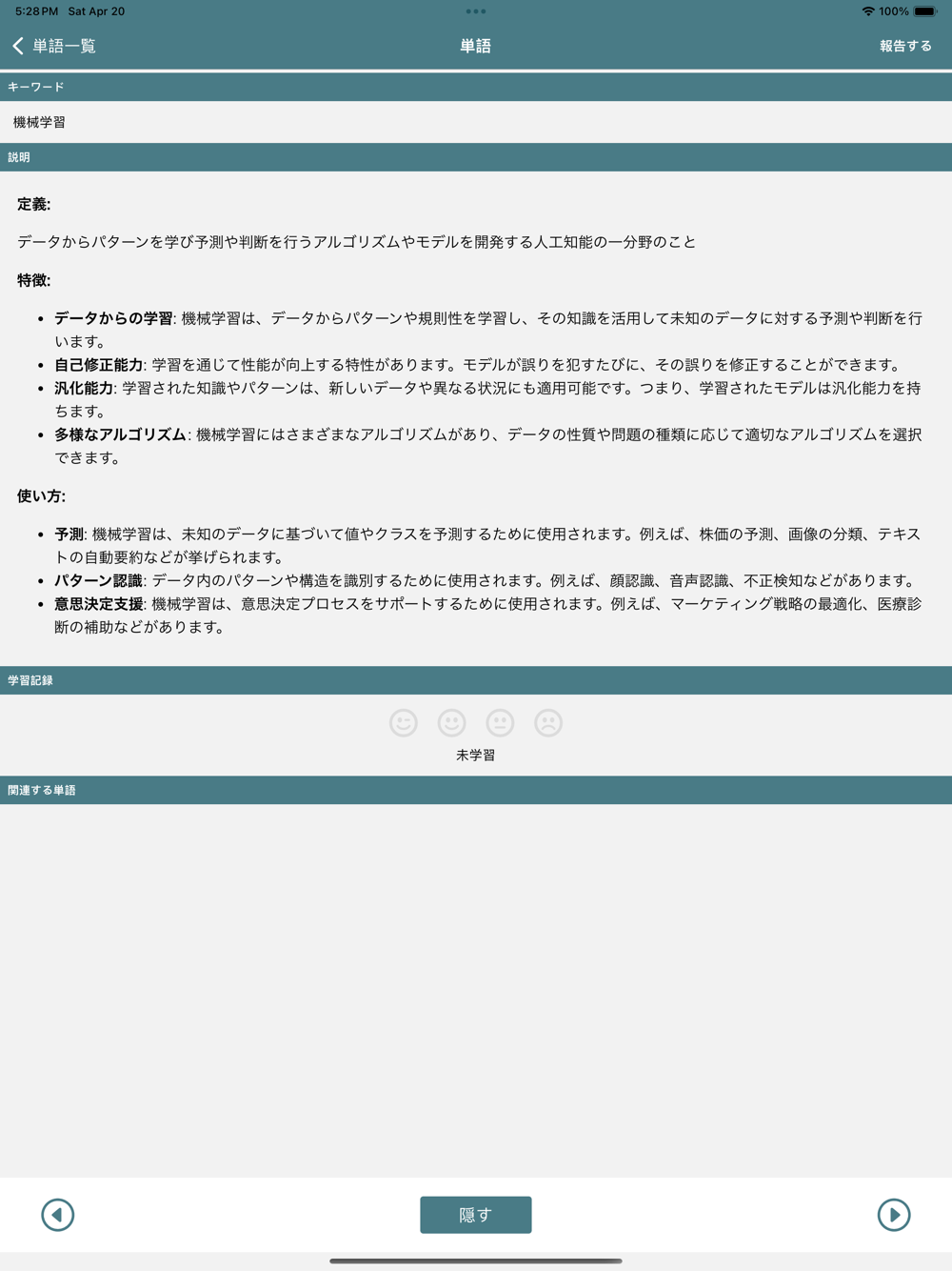 各カテゴリから単語一覧を選択し、任意の用語をタップすることでその詳細を確認できます。説明文は簡潔ながら実務的な内容を重視。さらに「隠す」ボタンを押すことでキーワードや定義文を「???」に変換し、記憶のアウトプット訓練が可能です。