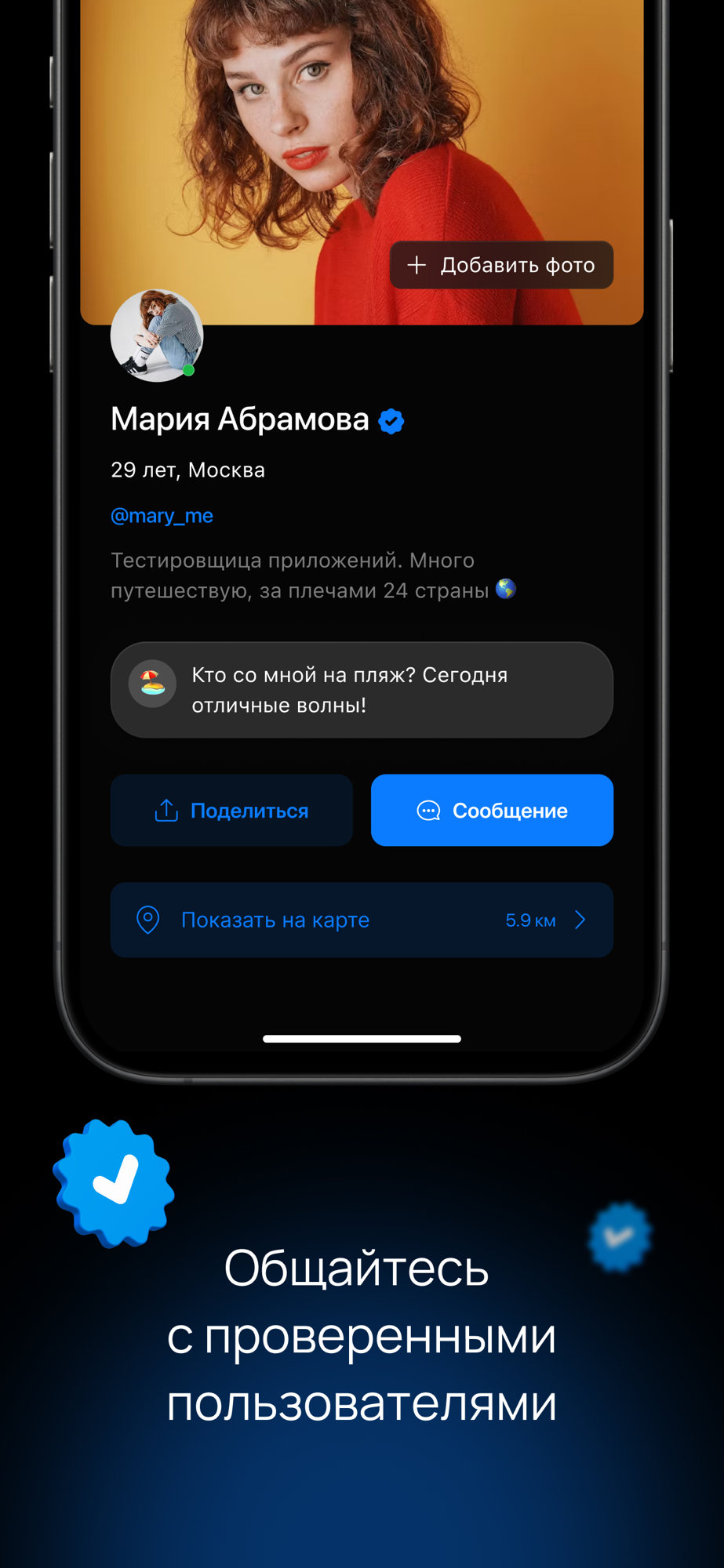 Пользователи отмечаются с помощью персонализированных эмодзи и статусов, показывающих их текущее настроение и готовность к встрече в реальной жизни.