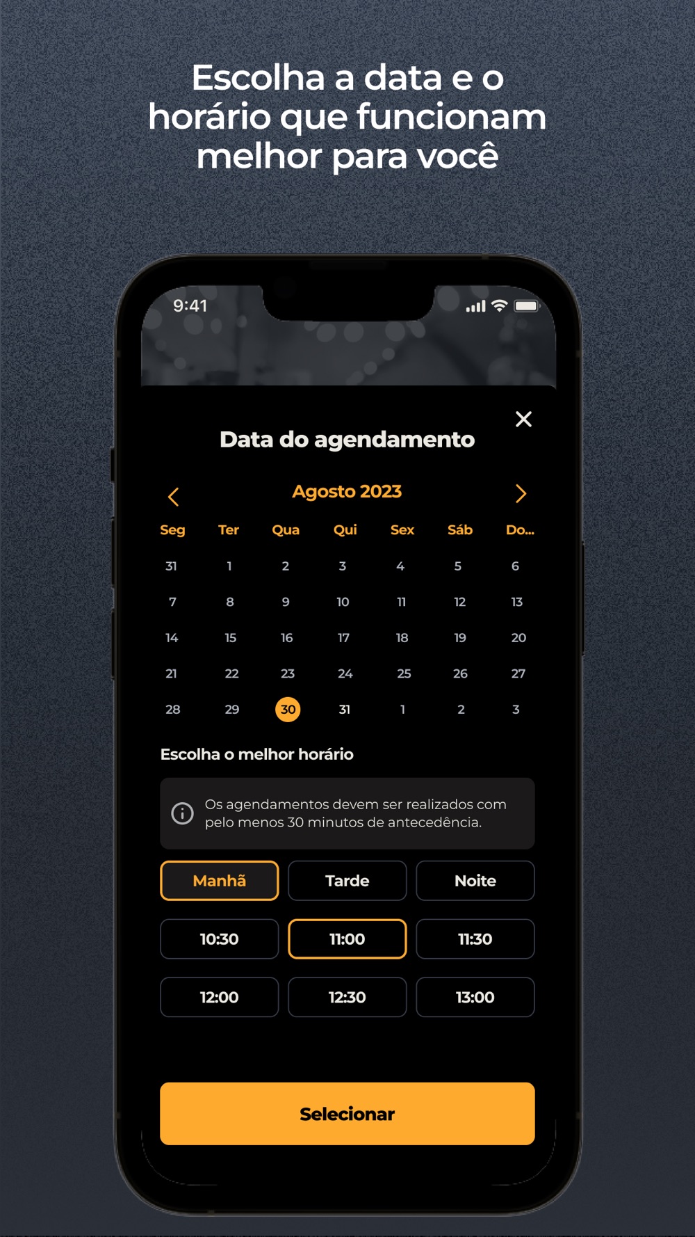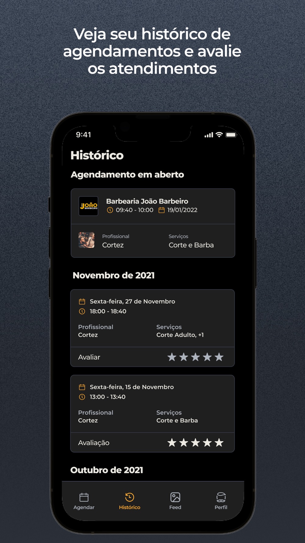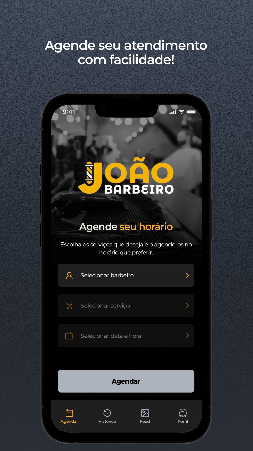 Através do App Barbearia João Barbeiro os clientes podem realizar seus agendamentos de uma forma muito mais prática. Na tela inicial, é possível selecionar os serviços e horário desejado para seu próximo atendimento. Já na tela de histórico, você poderá avaliar como foi o seu atendimento, remarcar ou cancelar seus agendamentos. É possível também na tela do perfil o cliente editar suas informações, como e-mail, foto de perfil e telefone.