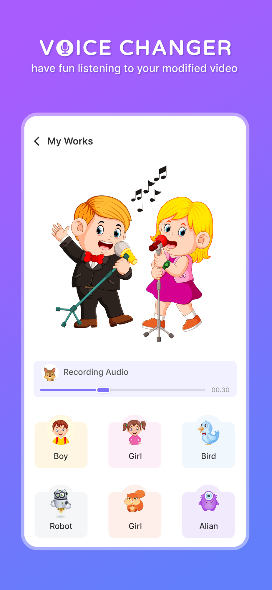 This Voice Changer with effects for Video can help change voice for video recorded or from a video file. You can change the audio in video clips with this video voice changer. You can make voice over or funny videos with interesting voice effects to share voice over on YouTube, TikTok etc.