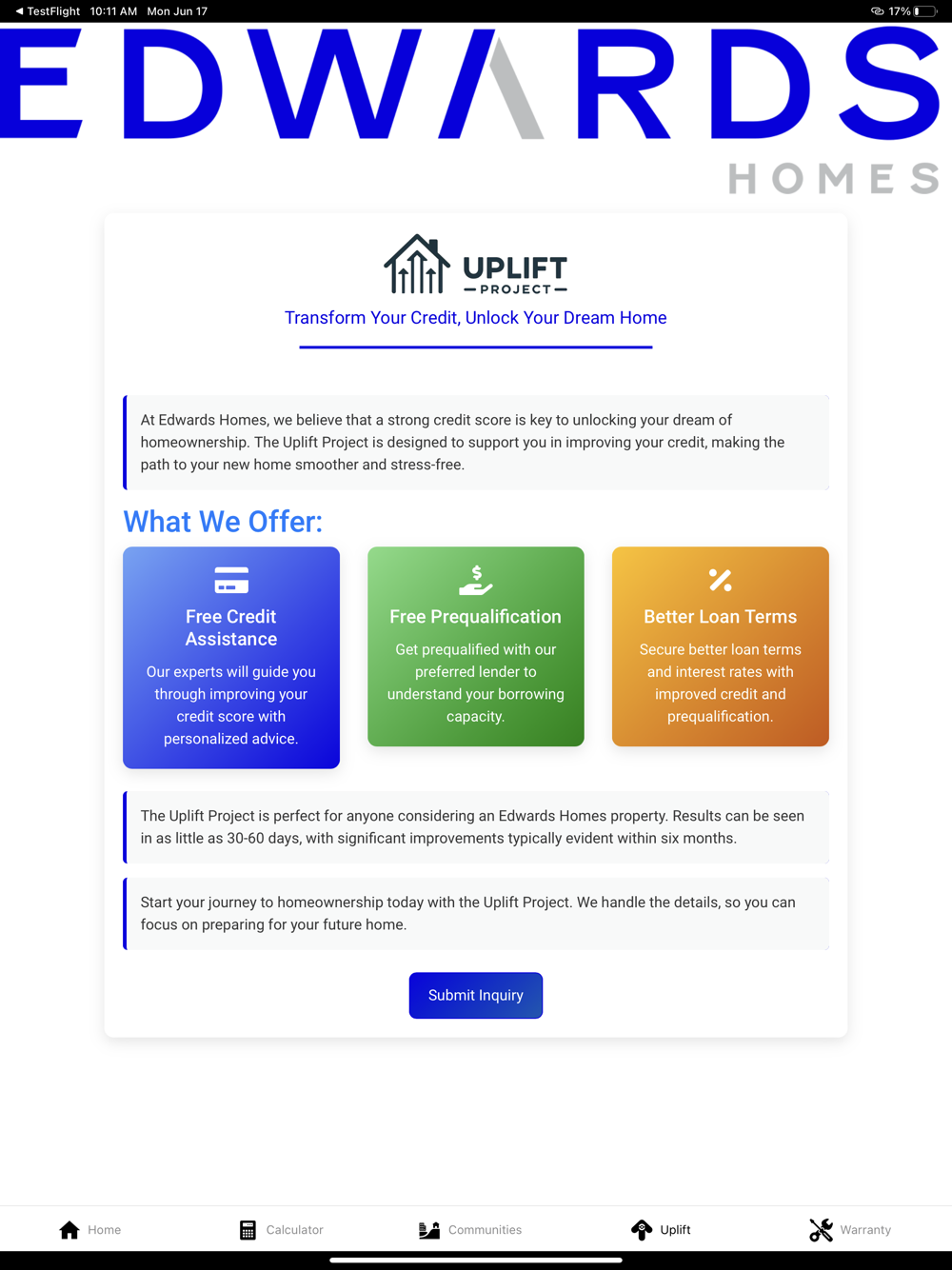 Welcome to the Edwards Homes app, your essential tool for managing your homeownership experience and exploring new home buying opportunities. For homeowners, the app allows you to easily submit and track warranty tickets for any issues with your home, providing real-time updates on the status of your requests and quick access to our customer support for any home-related concerns. Potential buyers can explore the Uplift Project, our in-house credit repair program designed to help you qualify for your dream home. The app offers personalized tips and resources to improve your credit, along with expert guidance from our advisors to support you on your home buying journey. Download the Edwards Homes app today to streamline your homeownership experience and take the first step towards owning your dream home!