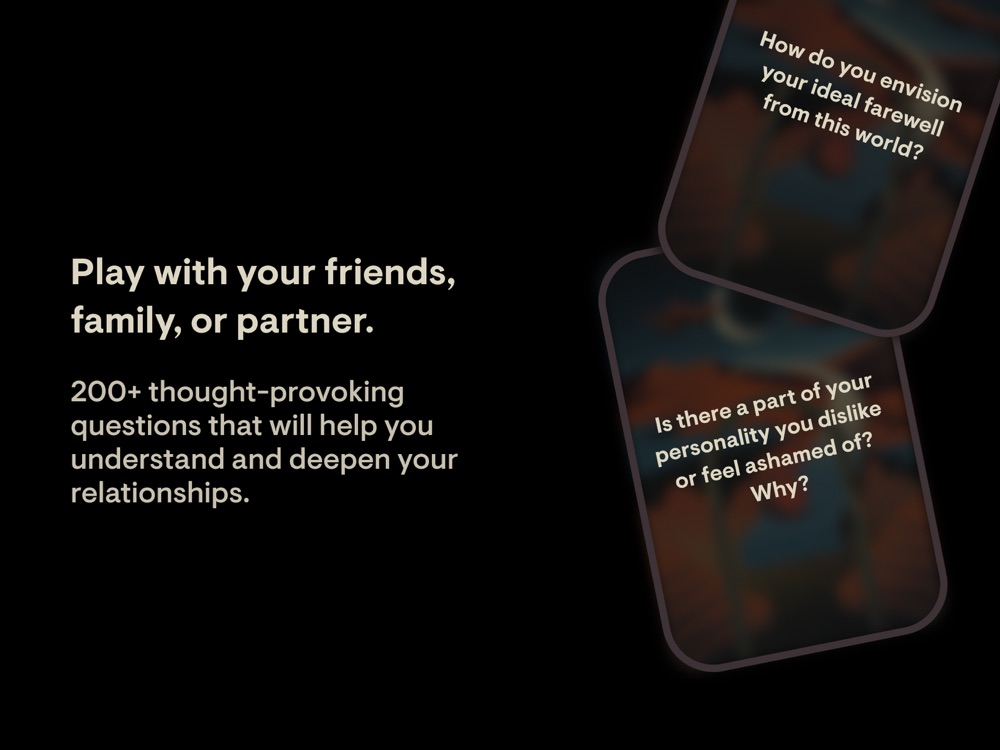 With offers over 200 cards across different levels of intimacy, tailored for various setups such as family gatherings, friends, and more. Whether you’re looking to deepen your relationships or gain insight into your own thoughts and feelings, With provides a versatile tool for connection and self-discovery.