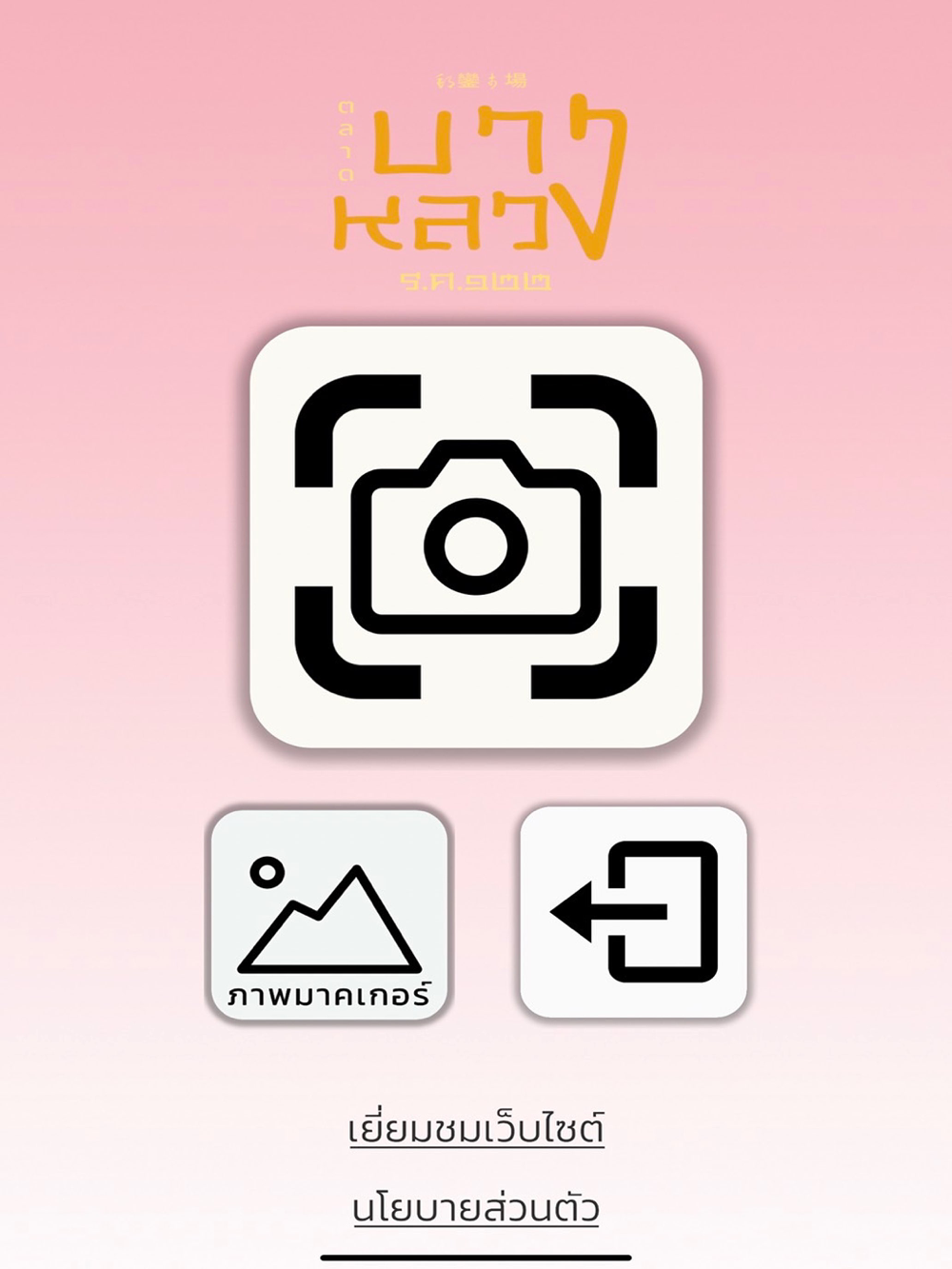 4. เมื่อเข้าสู่หน้าหลักของแอป จะมเห็น ไอคอนเปิดกล้องเพื่อสเเกนภาพมาคเกอร์อยู่ด้านบนตรงกลาง , ไอคอนภาพมาคเกอร์อยู่ด้านล่างข้างซ้าย , ไอคอนออกจากเเอพอยู่ด้านล่างข้างขวา เเละเมนูย่อย ด้านล่างสุด จะเป็น เมนูเยี่ยมชมเว็บไซต์ กับ เมนูนโยบายส่วนตัว