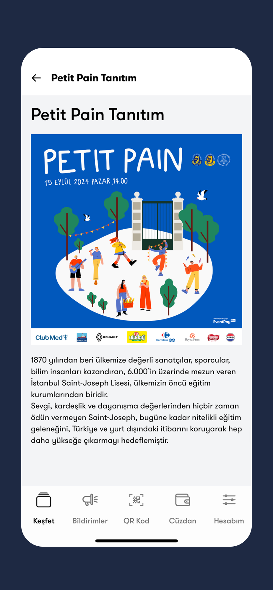 Petit Pain SJ etkinliklerinde zaman kazandıran “hızlı öde & geç” sistemini hemen ücretsiz indirerek siz de tüm etkinliklerimizde ortak şekilde çalışan cüzdanınızın keyfini doyasıya çıkartın.