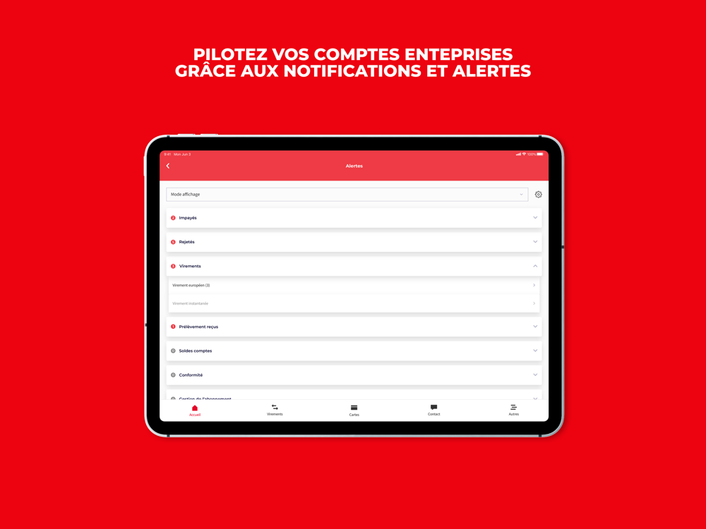 - Soyez notifié des événements clé de votre entreprise que vous avez définis (solde de compte au-dessus d’un seuil fixé, virement reçu, retour d’impayés de toute nature…)