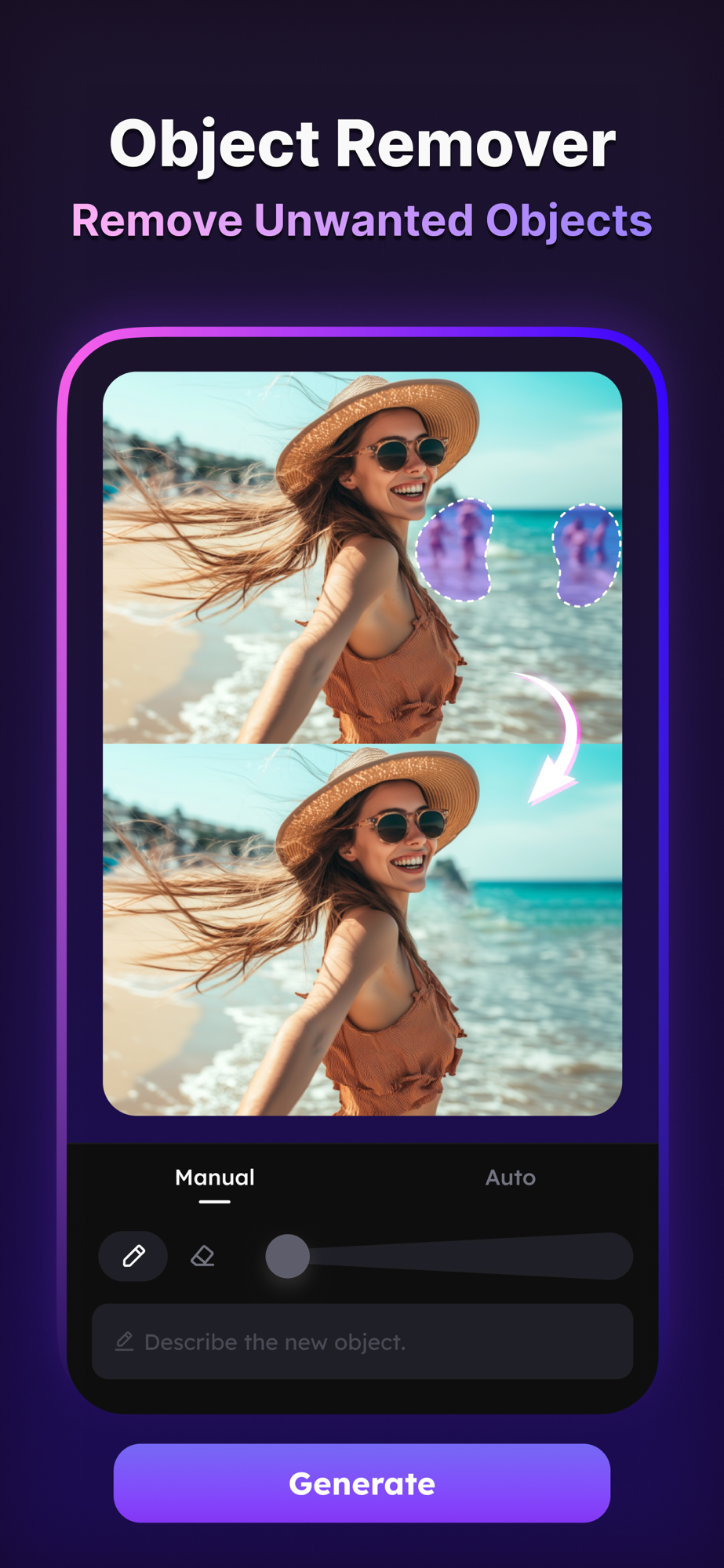Get rid of any unwanted objects in your photos. Remove passersby, power lines, cabs, annoying text or ads from photos in seconds.