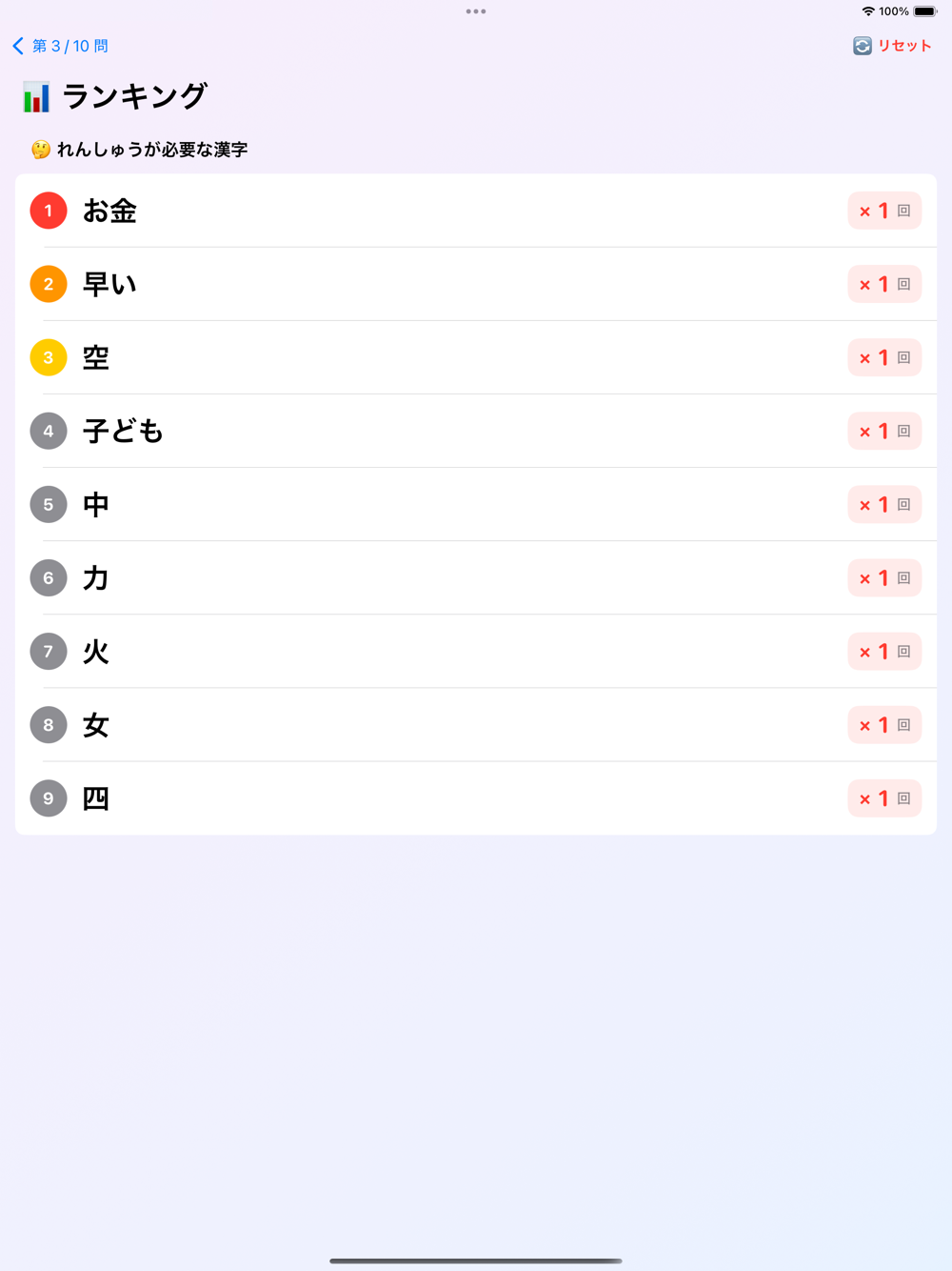 80字をランダム10問ずつ出題し、苦手な漢字は自動でリスト化して集中的に復習!正解すると「nice」などと音声フィードバック。広告やトラッキングは一切無し。お子さまの学習はもちろん、確認テストにもどうぞ。回答用紙をシェア・印刷機能も実装。実際に、紙に書いて回答することに拘りました。
