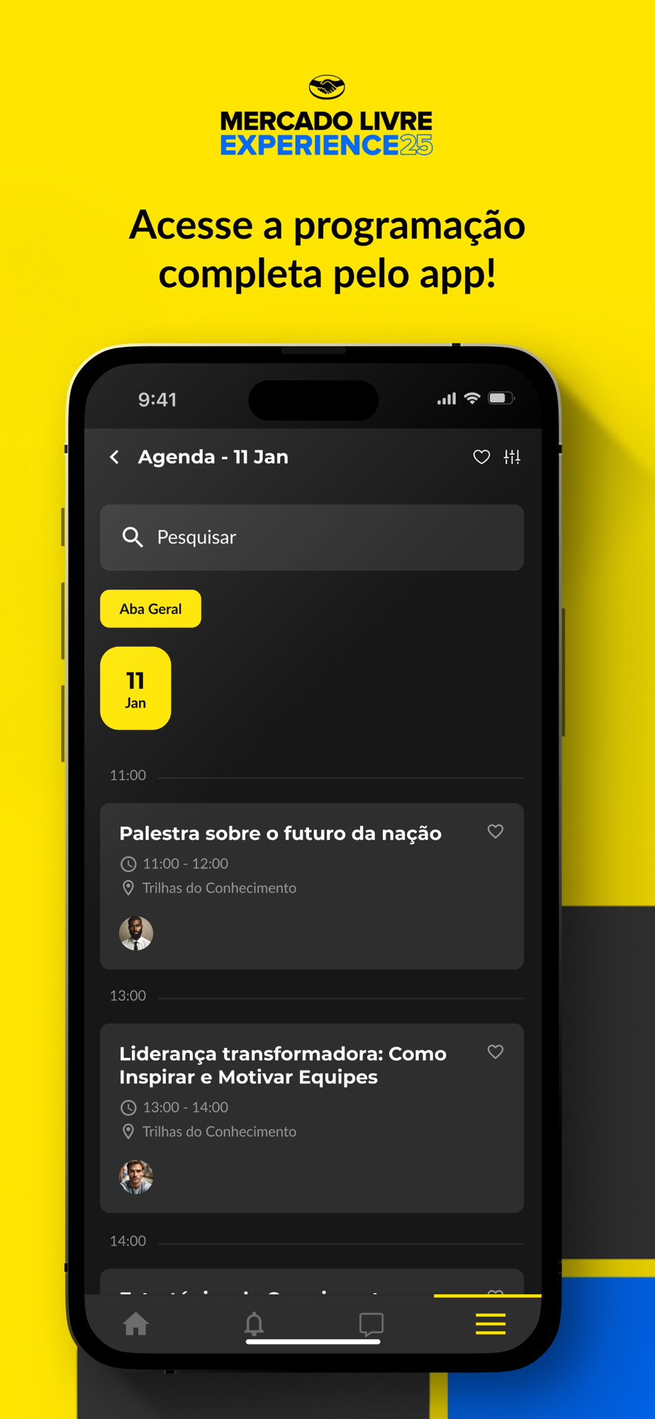 Com o aplicativo Mercado Livre Experience 2025, você terá acesso completo à programação do evento, podendo consultar os detalhes de cada palestra e sessão. Além disso, o app permite que você receba notificações importantes para não perder nada do evento, participe de chats com outros participantes para trocar ideias e informações, explore a lista de palestrantes e conheça mais sobre eles. Através da área de networking, é possível adicionar novos contatos e expandir sua rede de relacionamentos. Também é possível interagir na timeline do evento, compartilhando suas ideias, curtindo postagens e aproveitando todas as funcionalidades que o app oferece para tornar sua experiência no evento ainda mais completa.