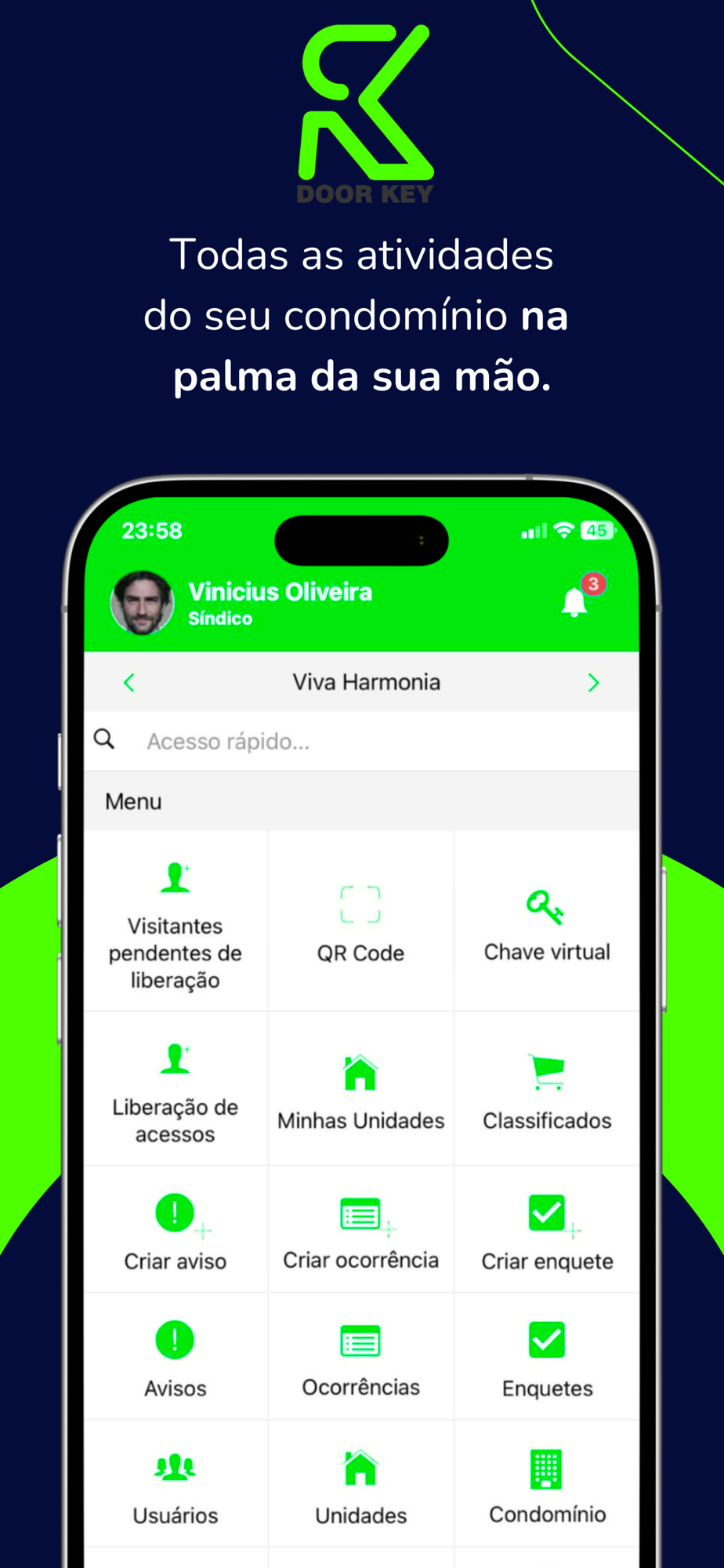 O Door Key é um aplicativo descomplicado, com o propósito de criar uma rede colaborativa e completa para síndicos, funcionários e todos os condôminos.