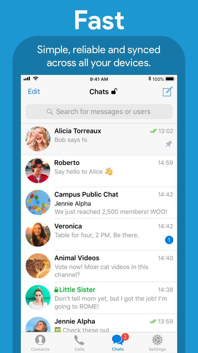 SYNCED: You can access your messages from all your phones, tablets and computers at once. Telegram apps are standalone, so you don’t need to keep your phone connected. Start typing on one device and finish the message from another. Never lose your data again.